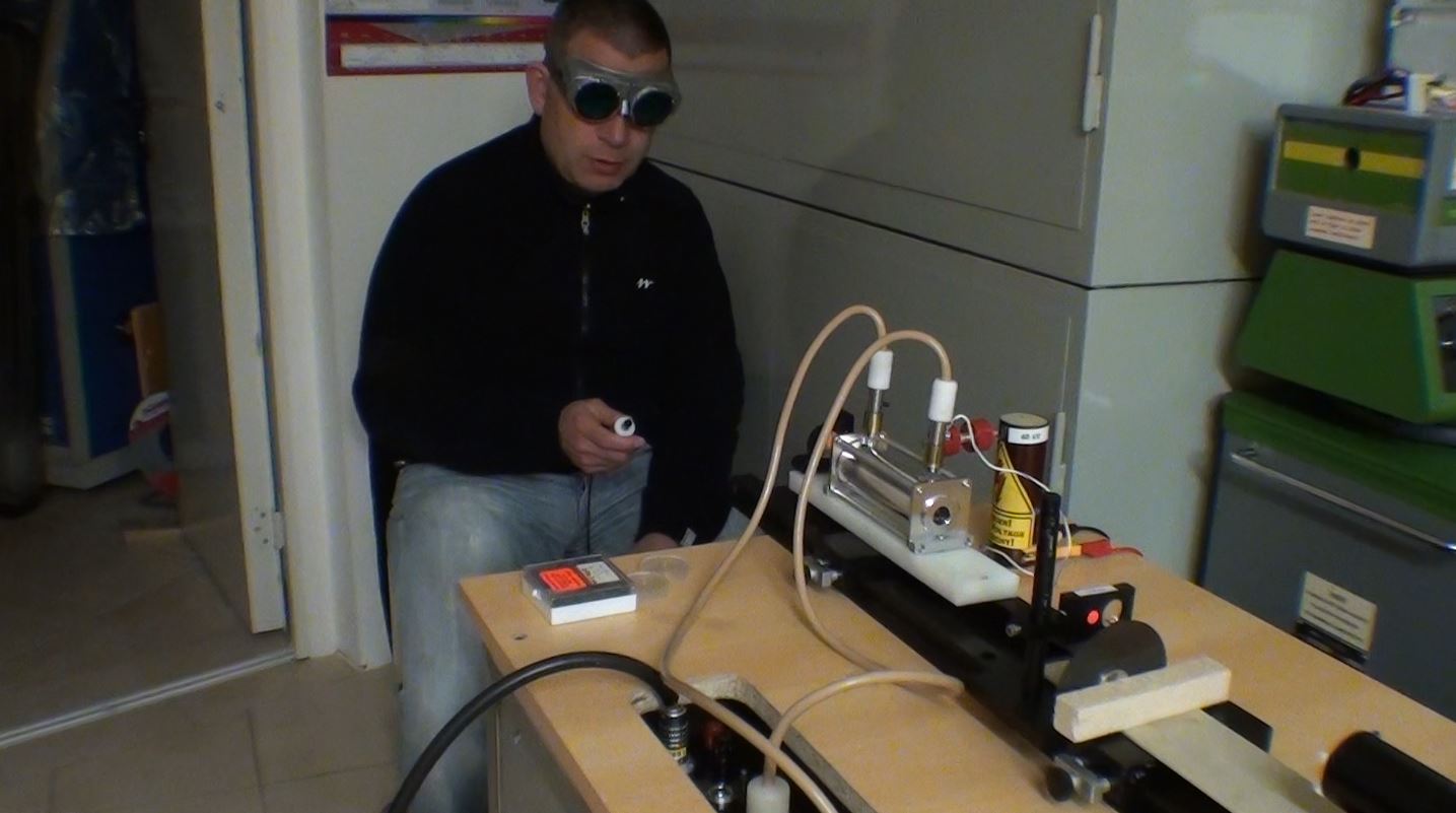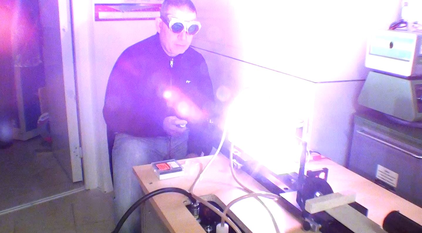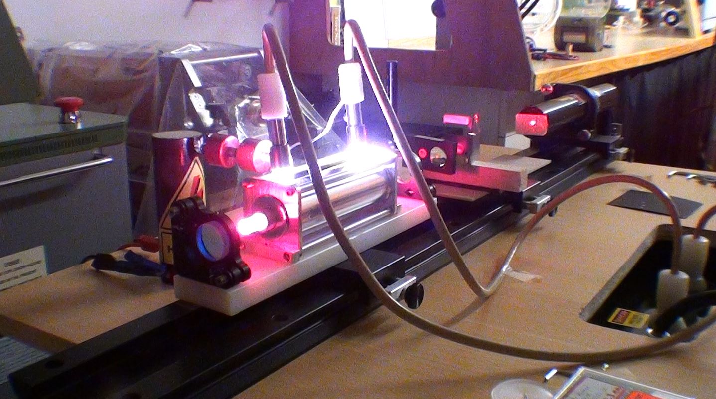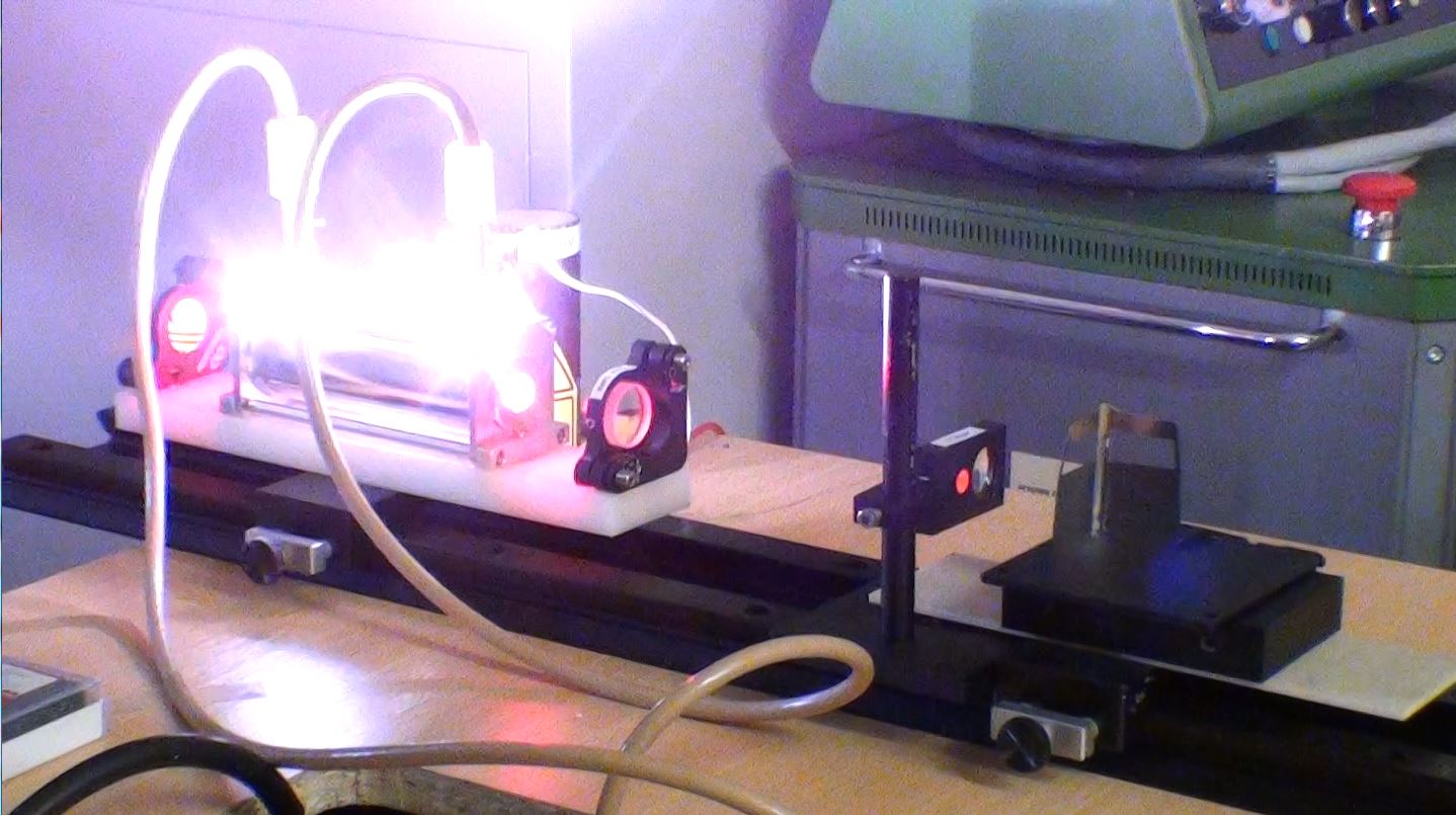 Un test pour vérifier l'amorçage du tube flash par une bobine "TRIGGER" de 40kV. Le laser se compose d'un miroir multi-diélectrique de 50% de transmission avec un rayon de courbure de 4mètres et d'un miroir à 99.85% de réflexion.