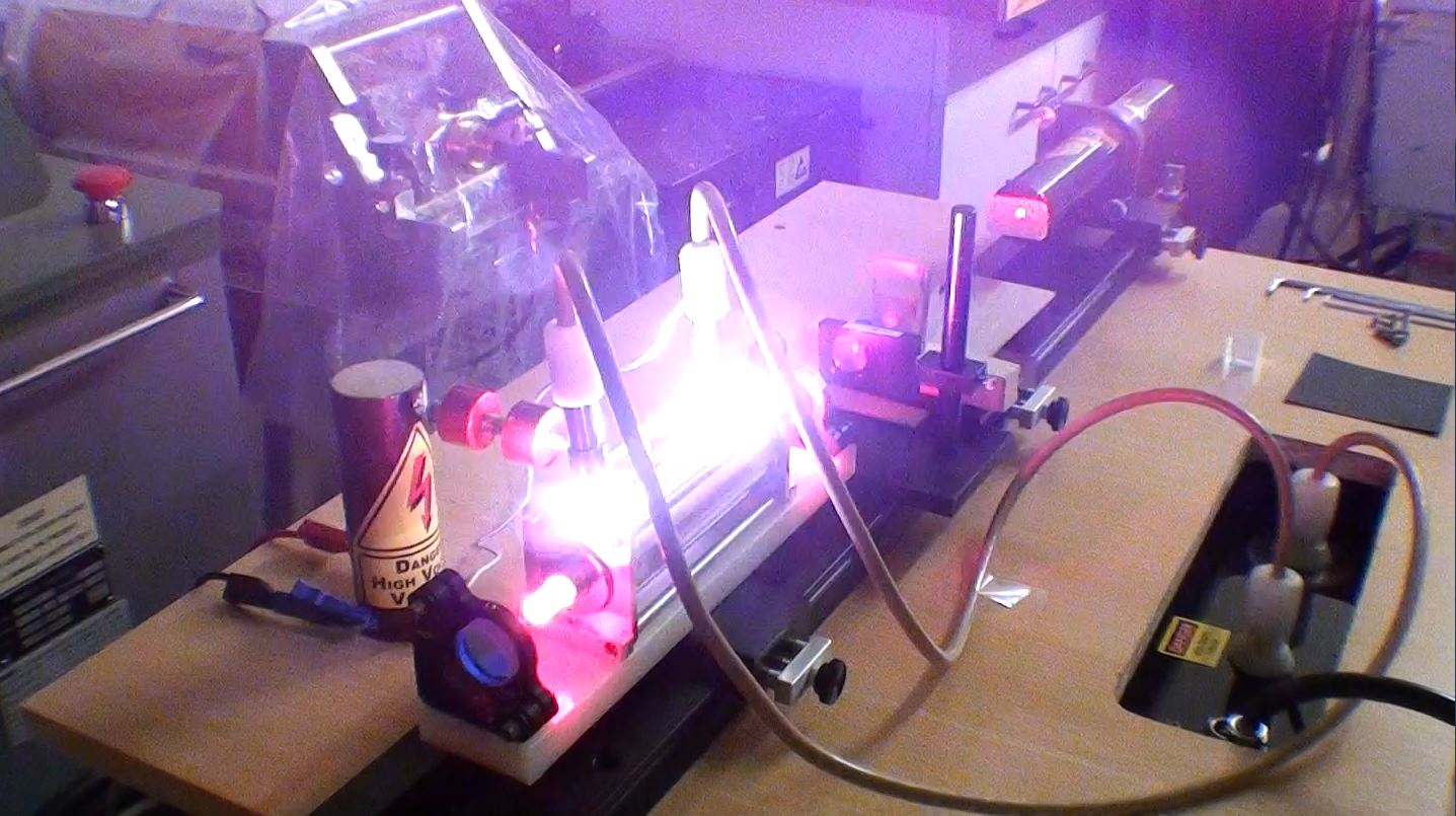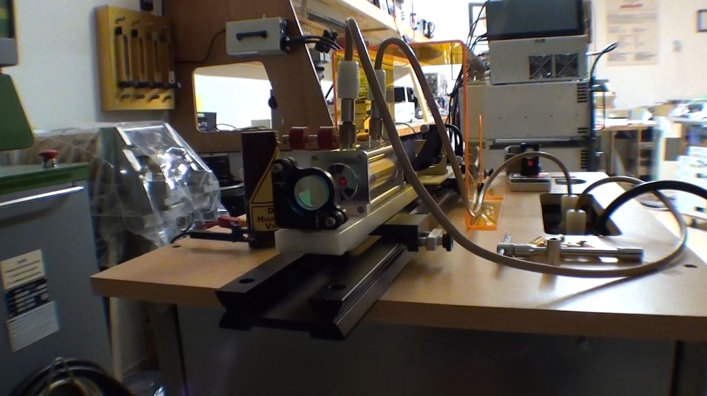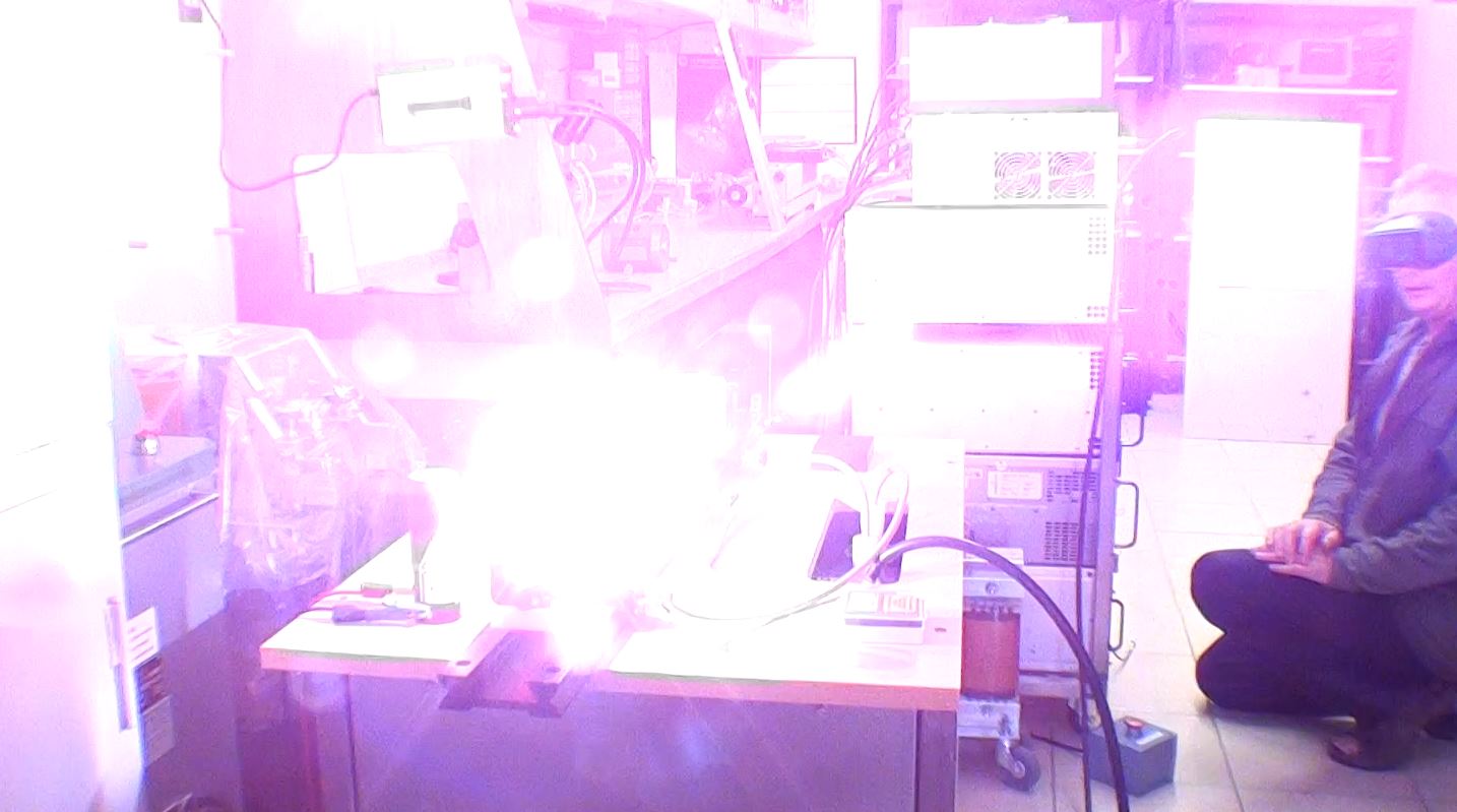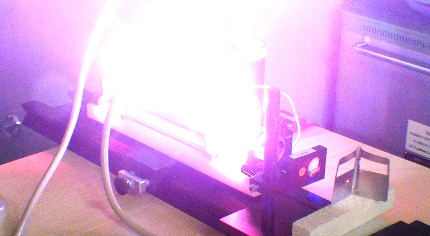 Un test pour vérifier l'amorçage du tube flash par une bobine "TRIGGER" de 40kV. Le laser se compose d'un miroir multi-diélectrique de 50% de transmission avec un rayon de courbure de 4mètres et d'un miroir à 99.85% de réflexion.