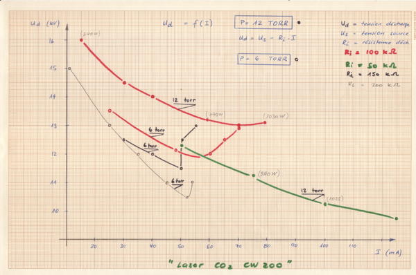 Diagramme du courant de décharge dans le tube en fonction de la tension d'arc et de la pression du mélange 80He/15N2/5CO2 La puissance de sortie à 22 torr de pression et 150mA est de 215W continu TEM01