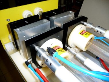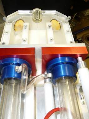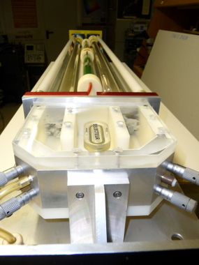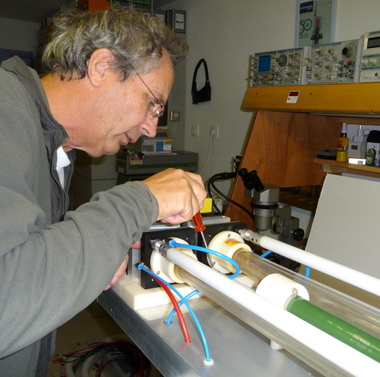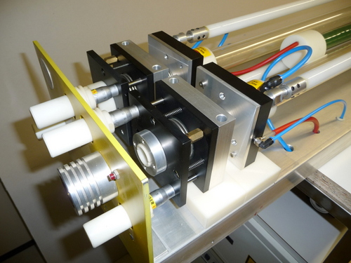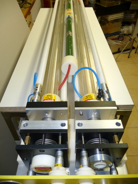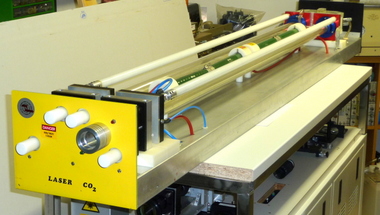 Voici le premier laser CO2 continu que j'ai construit en 1975. Ce laser ce compose de 2 tube de PYREX® de 20mm de diamètre intérieur et 1540mm de long.Chaque tube est pourvu d'une anode et d'une cathode alimenté en HT 25kV DC 150mA. En série se trouve des résistances de 100kOhm.Le couplage l/d=116 donne un miroir de sortie de R65%. Le résonnateur optique est de type "CONFOCAL" R1+R2=L; La longueur du résonnateur est de 3600mm, il se compose de 2 miroirs de renvoi en CuBe doré R 99.5% qui sont montés sur un système micrométrique à 45 degrés dans la boite de renvoi qui est reliée à la masse du chassis. Le miroir totalement réflecteur est en CuBe doré avec un Rayon de courbure de 3500mm R99.5% et le miroir de sortie en ZnSe R 65%/AR avec un rayon de courbure de 3500mm. Le diamètre du faisceau TEM01 est de 6.6mm la divergence du faisceau de 1.7 mrad. Pression de travail 16 - 24 torr Courant décharge 50 - 150mA Eau refroidissement 2L/min Gaz 30 L/h