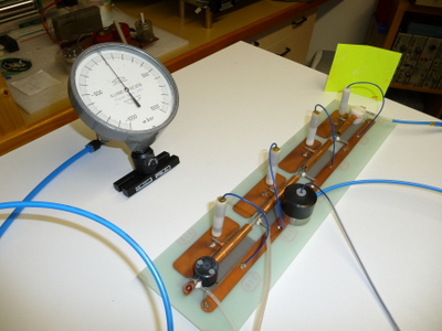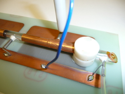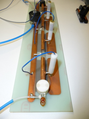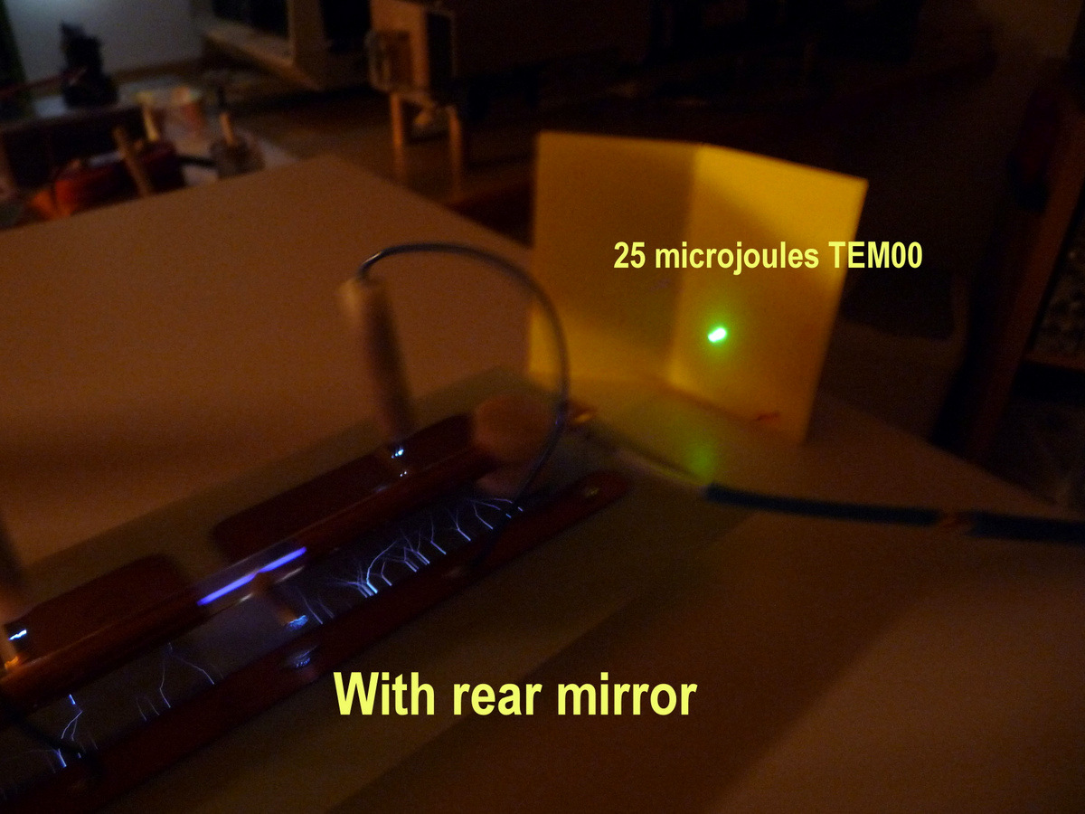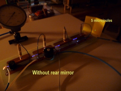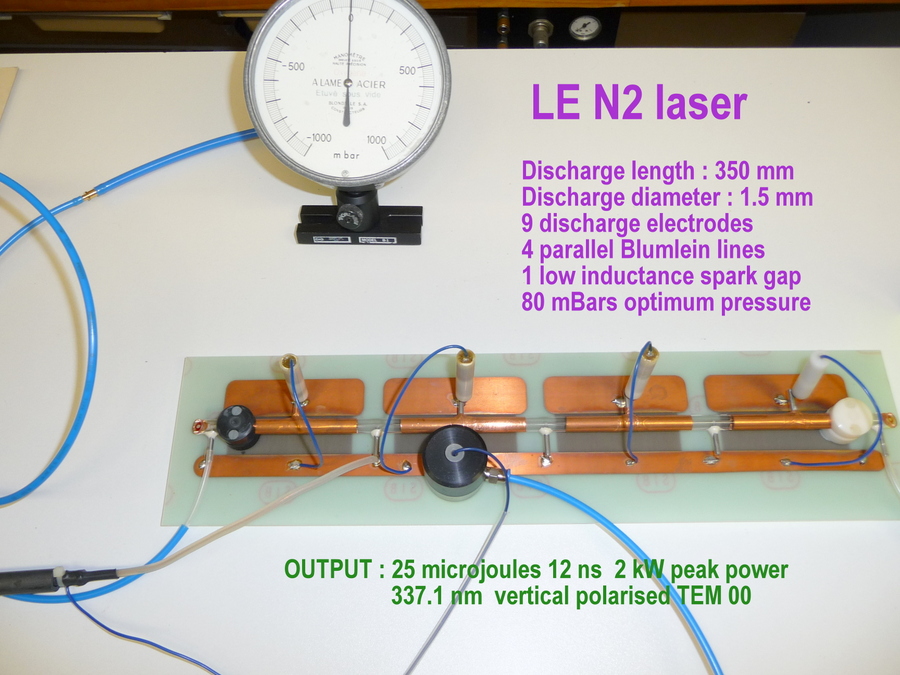 Laser N2 à décharge longitudinal. Ce laser se compose 8 secteurs de décharges longitudinales avec9 électrodes de décharge en inox collées sur un tube PYREX capillaire muni aux 2 extrémités de fenêtres de Brewster. Le faisceau laser est rond et monomode par le diamètre du tube intérieur de 2mm! La puissance crête est de 2kW pendant 12 nanosecondes. Le faisceau est polarisé verticalement par les fenêtres de Brewster. Le circuit de décharge est une ligne de blumlein un peu spécial plutôt une "Blumlein-Neracher" avec un éclateur coaxial.
