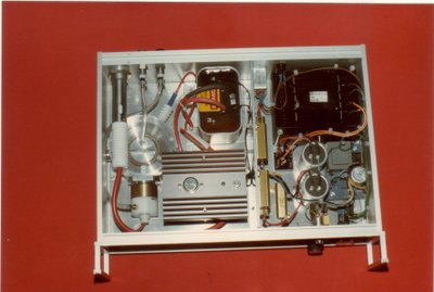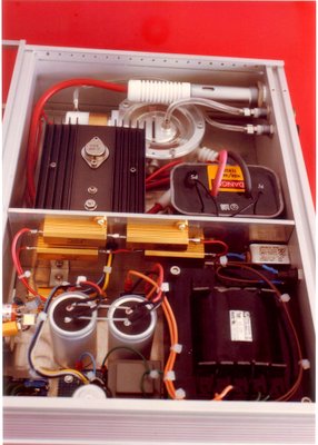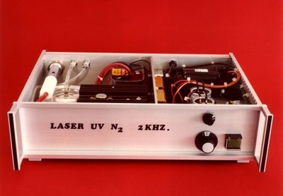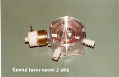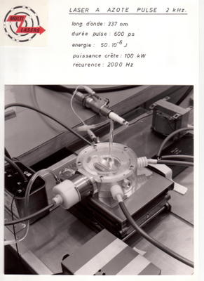 Développement réalisé en 1979 Ce laser se compose d'une ligne de Blumlein en BaTiO3 et d'un éclateur multi-disques permettant de travailler jusqu'à 2000 pulses par seconde. Une des 2 électrodes de décharge est munie d'une tuyère permettant de faire circuler de l'azote jusqu'à 5 ms-1 pour renouveler le gaz encore chaud de la décharge précédente. L'échappement se fait à l'air ambiant car la transition B3IIg à Au3 à une durée de vie de 1s pour retomber au niveau fondamental sinon on ne peux plus obtenir un effet laser! La section du faisceau est de 2 x 1mm2