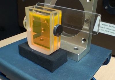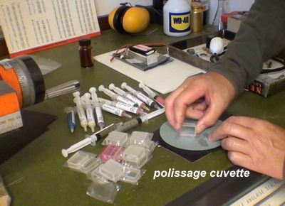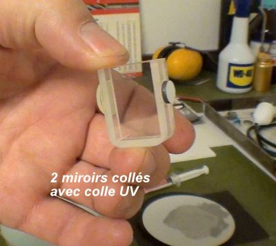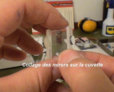 Fabrication d'un résonateur DYE Pour cela j'ai utilisé une cuvette pour photo spectromètre de dimension 10x20mm. Il a fallut polir les 2 faces avant de collé les miroirs totalement réflecteur et semi transparent dur la cuvette avec de la colle UV photo polymérisable.