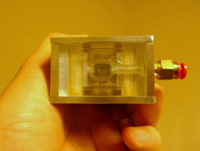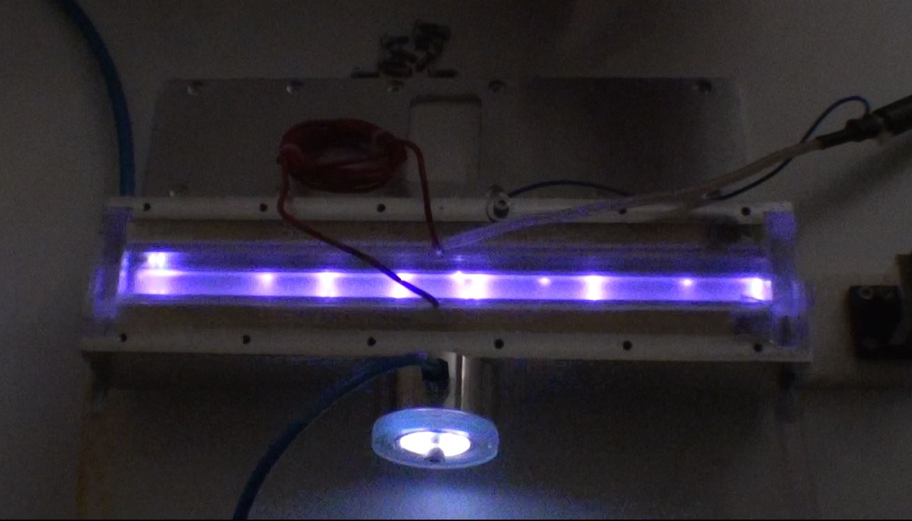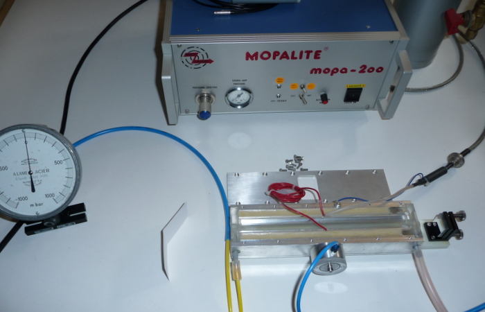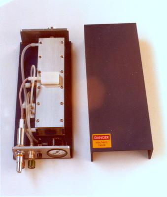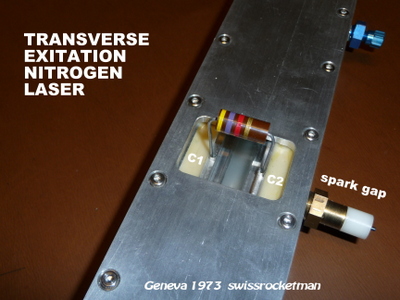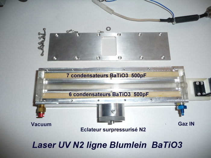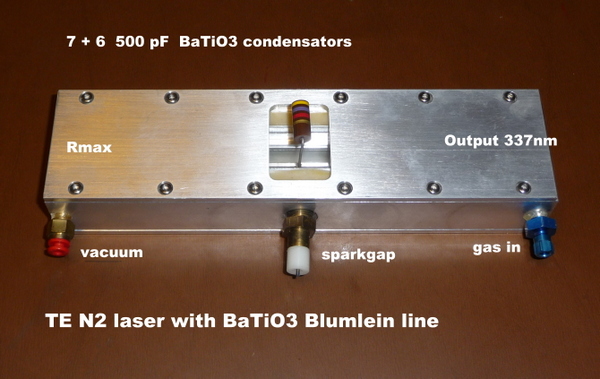 Ce laser se compose d'une ligne de Blumlein d'un coté composée de 7 condensateurs en titanate de barium de 500pF collé avec de la colle conductrice sur le première électrode de décharge et sur l'autre électrode se trouvent 6 condensateurs de 500pF et un éclateur. Le boîtier extérieur en aluminium fait office de masse et de conducteur de courant lors de la décharge des condensateurs.