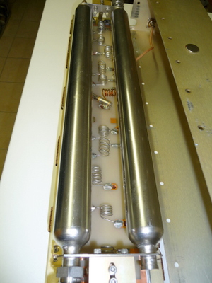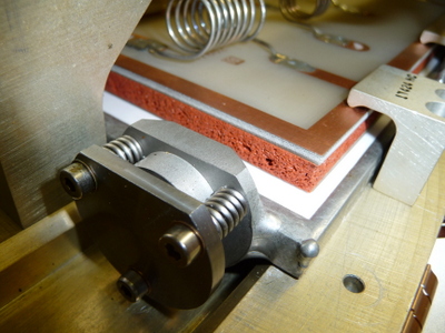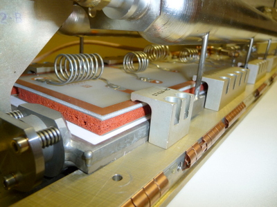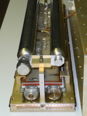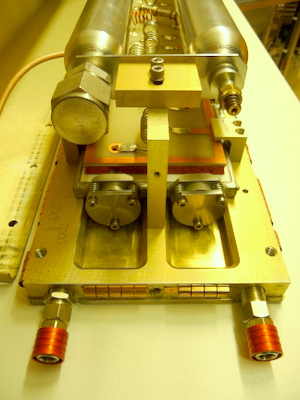 Ce laser se compose d'une plaque en oxyde d'aluminium dans laquelle j'ai usiné une rainure de 1.5x1.5mm de façon à réaliser un guide d'onde. La forme du résonateur est un "Z" chacune des branches sert de milieux amplifiant par excitation transversal du mélange laser He/N2/CO2; Cette cavité est munie d'un miroir totalement réflecteur, de 2 miroirs de renvoie et d'un miroir semi-transparent R=90%; Un générateur HF à 27.12 MHz de 600W sert à exciter la cavité laser. La puissance de sortie est de 52W cw, le refroidissement se fait par la plaque de base en aluminium.