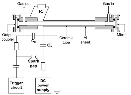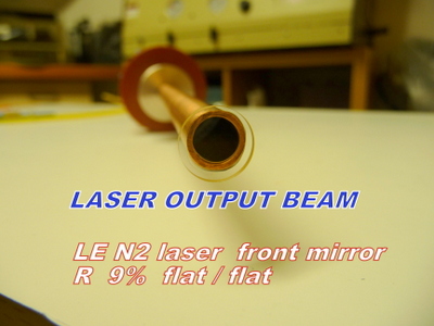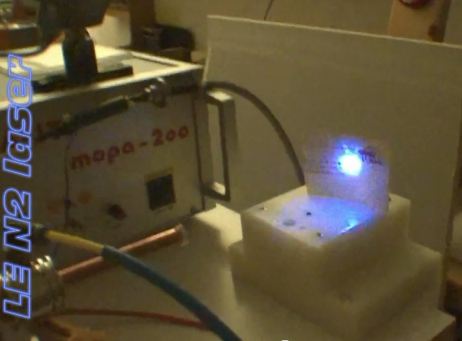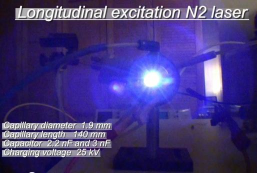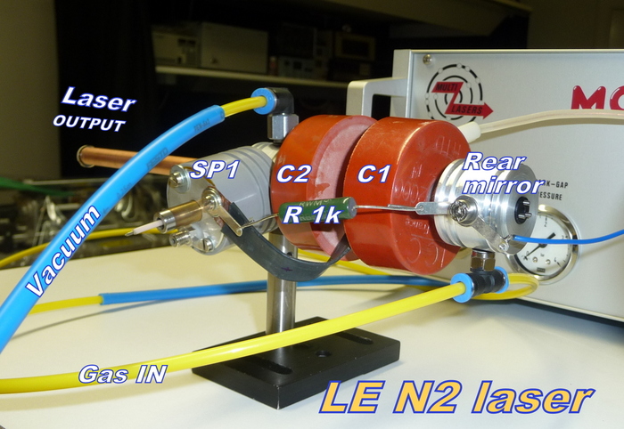 1. L'alimentation HT DC charge au potentiel +U, les condensateurs C1 et C2 , C1 à la masse et C2 à la masse à travers R2 (environ 500 Ohms à 2 kOhms) le potentiel à ce moment sur Co est de 0 volt. 2. Le spark gap SG décharge le condensateur C2 donc les polarités durant le 1er cycle sont inversé le coté + devient - donc la tention aux bornes de C1 et C2 devient C1+C2 soit 2U ( en réalité pas tous à fait perte résistive et inductive et capacitive) 3. La tension 2U apparait sur les électrodes Q1 et P1. En face se trouvent les électrodes Q0 et P0 relier au condensateur Co Le condensateur Co est déchargé donc il va y avoir une étincelle entre Q1 et Qo et une autre étincelle entre P1 et Po qui va transféré la charge C2+C1 sur Co. 4. Ces 2 étincelles vont émettre de la lumière ultraviolette qui va pré-ionisé le gaz à l'intérieur du capillaire permettant d'obtenir une décharge homogène durant la décharge de pompage. 5. Puis le condensateur Co étant chargé à 2U va se décharger entre les électrodes Qo et Po ce qui va pompé l'azote pour obtenir une inversion de population qui après donnera l'effet laser dans le résonateur. La topologie pour le condensateur Co est très importante pour avoir une décharge la plus rapide que possible. 6. Il faut un résonateur car le gain n'est pas assez grand si l'on veut obtenir une émission laser puissante surtout avec un tube de 15 cm de long . Un miroir HR et un OC de 30% sont idéal mais ça fonctionne déjà avec un OC de 8% (une simple lame de quartz)
