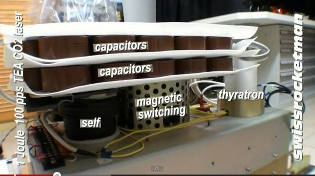 Mélange de gaz He/N2/CO2, pulseur thyratron, alimentation HT à découpage de 1kJ/s et 34kV