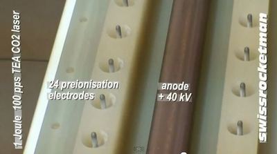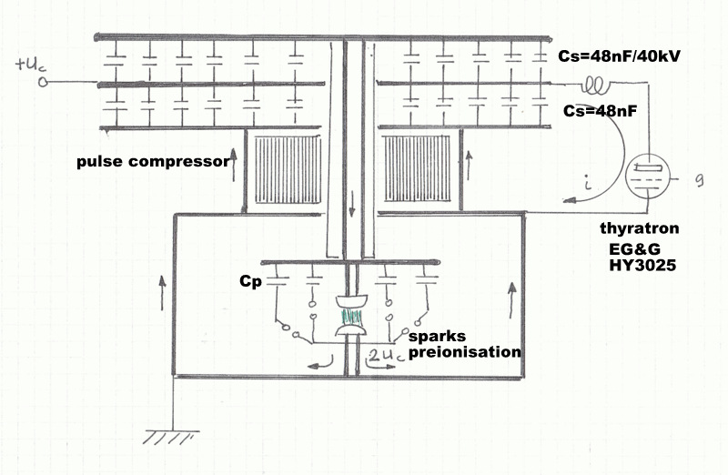 La décharge est appliquée sur la tête laser comprenant les 28 électrodes de pré-ionisations à travers un compresseur de pulse permettant de raccourcir la durée de décharge de 50ns à 6ns !