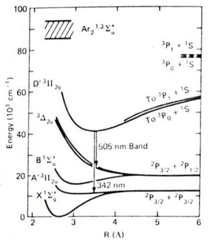 Le laser à iode dimer (I2 ) est une transition entre le niveau D' et A' le photon résultant à une longueur d'onde de 342nm il y a également une émission dans le vert à 505nm. La transition 342nm est super forte et la transition 505nm très faible. Le laser à iode moléculaire à aussi une transition dans le proche infrarouge à 1.3 micron c'est un laser à photodissociation du C3F7I et du CF3I que l'on pompe au moyen d'un tube flash ou d'un laser à excimer XeCl ou KrF. La photodissociation à lieu entre 240 et 340nm donc beaucoup plus facile à pompé car ici on peut utiliser des tubes flash en quartz ou SuprasilR
