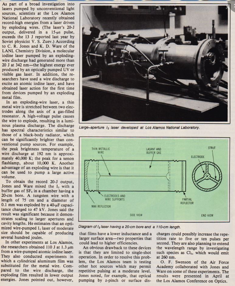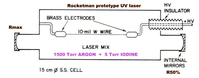 LASER A IODE MOLECULAIRE POMPE OPTIQUEMENT Ce laser est un laser à iode moléculaire émettant dans le proche ultraviolet à 342nm des pulses de minimum 2J et maximum bien optimalisé de 20J en 5 microsecondes. Le pompage est un pompage optique d'un mélange de 3 torr de Iode, 100 Torr de SF6 et 2 atm d'Argon L'excitation de la molécule I2 se fait en faisant exploser un fil de tungstène de 0.25mm de diamètre au moyen d'un condensateur de 40 uF chargé à 50kV ! (50kJ) Le plasma crée par la volatilisation du fil porté à une température de 25-30'000 °C va émettre des rayon ultraviolet que la molécule d'iode va absorber entre 180 et 200 nm. La bande d'absorption est D-X pour le iode se situe entre 180nm et200nm. Le gaz de dissolution qui est l'Argon va relaxé l'inversion de population par collision au niveau D'-A' depuis lequel la transition laser aura lieu. Le rendement quantique de cette transition avoisine les 50% ! La durée de vie radiative est de 10ns. Suivant le montage et l'énergie injectée on obtiendra une énergie de 2 à 20 J de sortie à 342nm.
