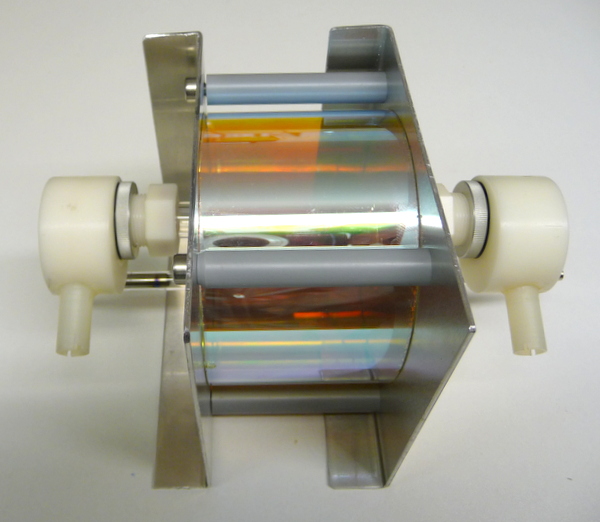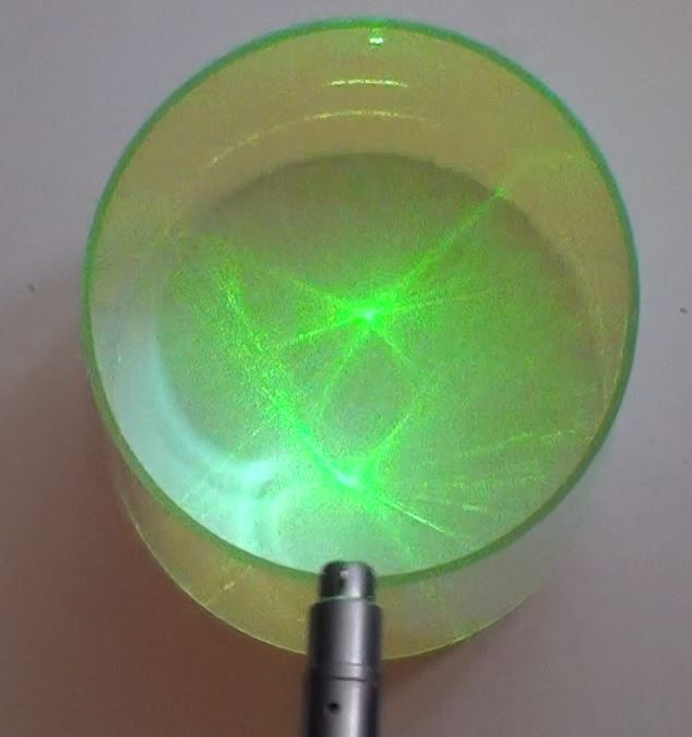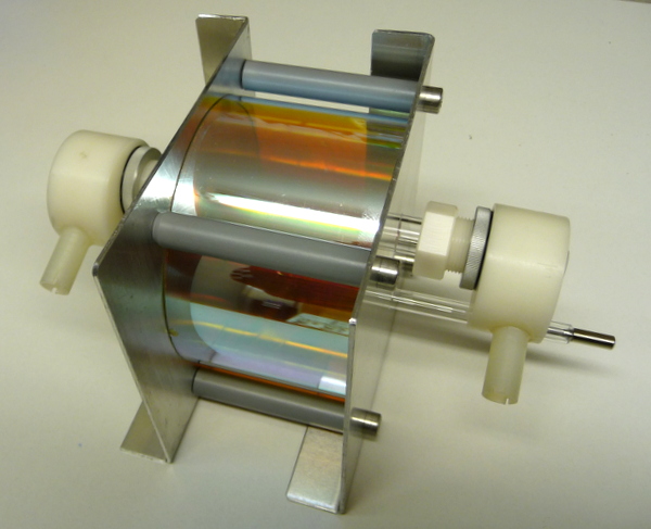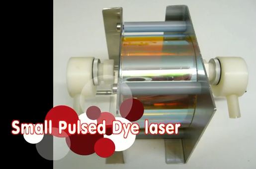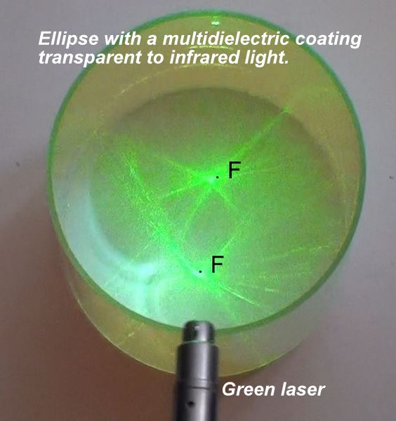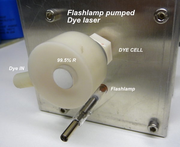 Petit laser à colorant R6G Laser à colorant Rhodamine 6G pompé par un tube flash sub-microseconde utilisant un réflecteur elliptique en DURAN recouvert d'un revêtement mutidiélectrique réflechissant les longeurs d'onde d'absoption de la Rhodamine 6G et laissant passer l'infrarouge.