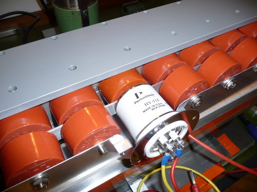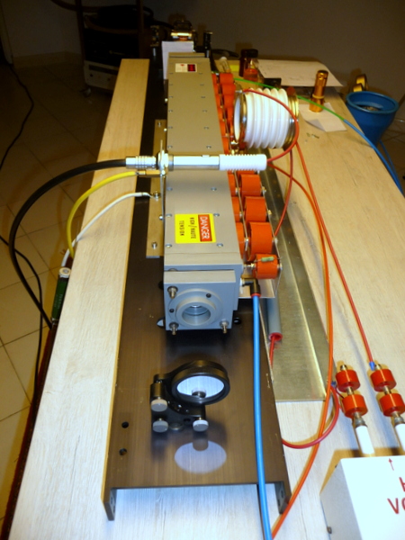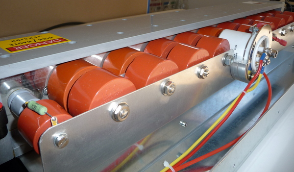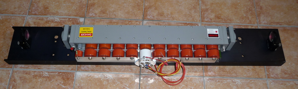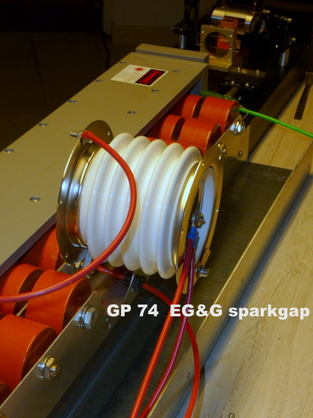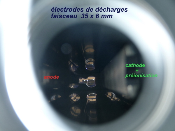 Une série de 10 condensateurs en titanate de baryum de 2200pF sont fixés sur la cathode munie d'une grille en inox derrière laquelle se trouve une électrode de préionisation. Une autre série de 9 condensateurs de 2200pF sont court circuités par le thyratron ce qui double la tension aux bornes des électrodes de décharges.