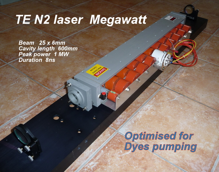 L'avantage majeur est une durée de pulse de 8ns ce qui est optimum pour le pompage des colorants. Autre avantage est une grande énergie et un faisceau de section rectangulaire de 25mm x 6mm.