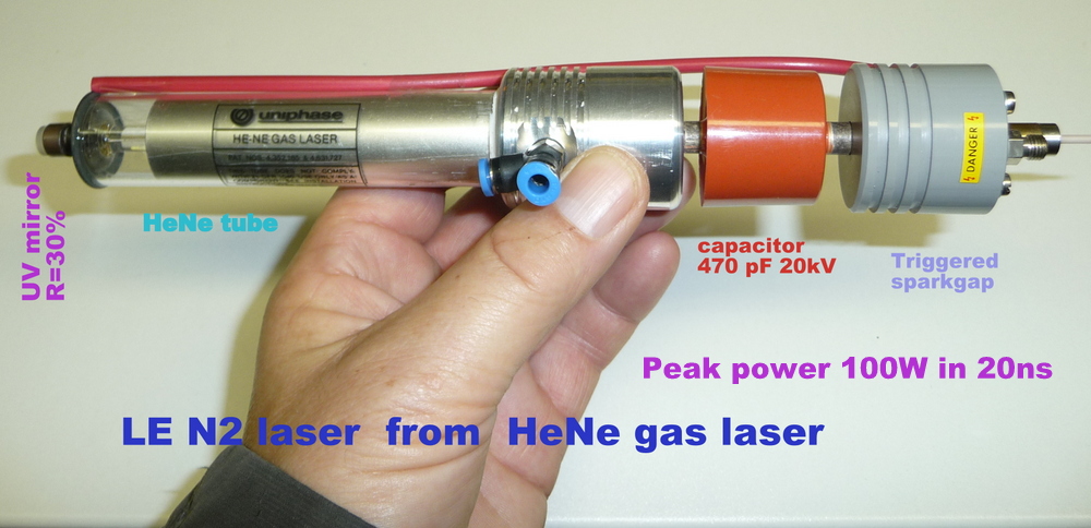Ce petit laser à azote à décharge longitudinal à été réalisé avec un ancien tube d'un laser HeNe de 1mW (UNIPHASE). Les miroirs du laser HeNe ont étés remplacés par un miroir totalement réflecteur en aluminium R=96%@ 337nm et un miroir multi diélectrique ayant une réflectivité de 30% @337nm. Un corps central en aluminium sert pour le pompage du tube,de l'entrée gaz et d'électrode de mise à terre ainsi que de support pour la capacité LCC de 470 pF 20kV. Sur la capacité se trouve fixé un éclateur permettant de décharger la capacité en une trentaine de nanoseconde. La tension de charge est de 25kV en 10 microseconde. Le tube de décharge en Pyrex à un diamètre de 0.9mm et 100mm de long. La pression optimum est de 25mbar soit 100V/torr/cm.