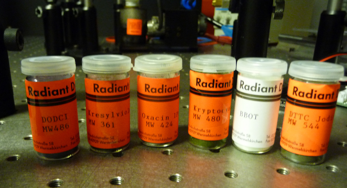 La solution test est au départ de la Rhodamine 6G à une concentration de 2.10-5 Mol soit 9.6 mg/litre. Le volume de colorant excité est de 3.5cc soit 4,2.1016 atomes de colorant. Pour obtenir une inversion de population il faut pompé 50% des atomes soit 2,1.1016 atomes