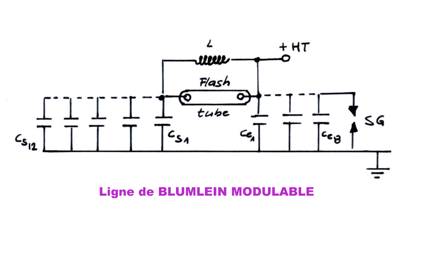 Le circuit de décharge se présente sous la forme d'une ligne de Blumlein avec comme commutateur un éclateur à vide EG&G type ...... D'un coté la capacité Cs et du coté de l'éclateur la capacité Ce. On peut moduler Cs et Ce suivant le nombre de capacité que l'on connecte dans chaque bras. Le minimum étant de 1 unité soit 2200pF/20kV et le maximum pour Cs = 26.4nF et pour Ce = 17.6nF