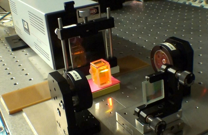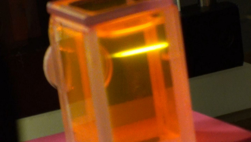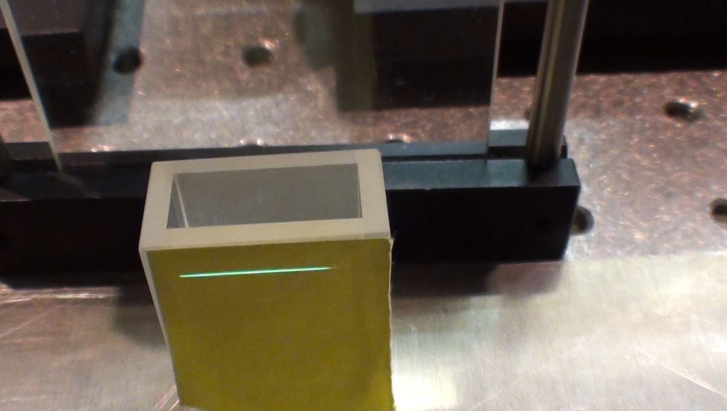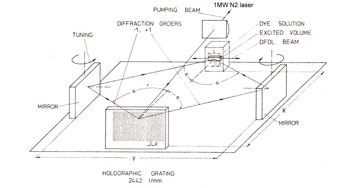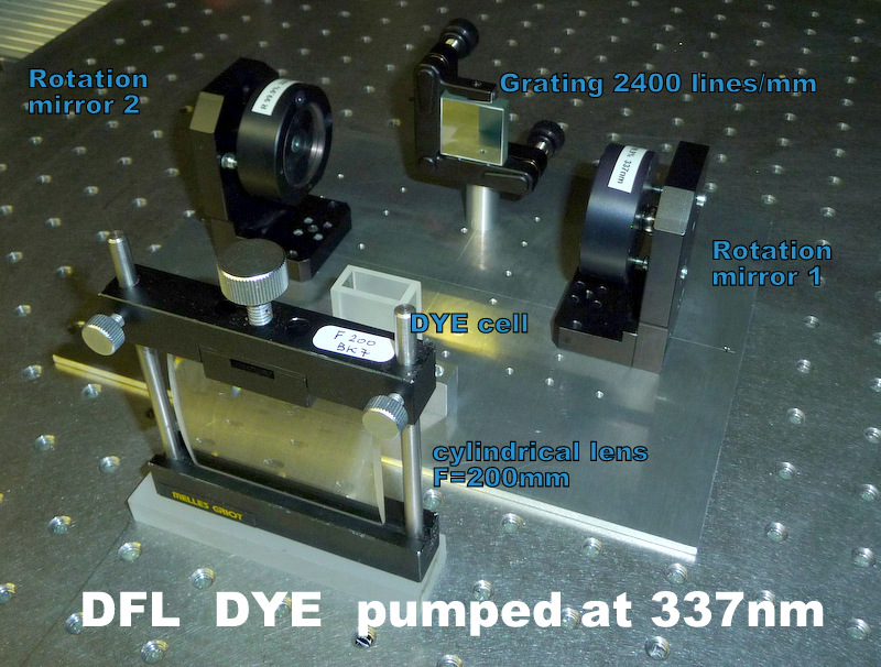 Chose étonnante la longueur d'onde d'émission de la Rhodamine 110 , 6G, B est identique et dépend uniquement de l'indice de réfraction du solvant. Pour ces 3 colorants R110,R6G,RB l'émission dans le méthanol est à 5450Å dans l'éthanol à 5500Å dans le DMSO à 5960Å et dans l'alcool benzylique à 6310Å. Si l'on désire obtenir des émission entre ces lignes alors il faut faire des mélanges des solvants. Une autre possibilité de changer la longueur d'onde d'émission est de changer l'angle auquel les 2 faisceaux pompe tombent sur la cuvette.