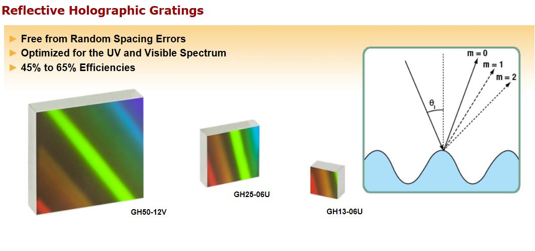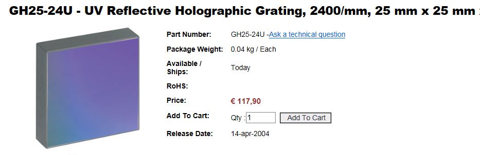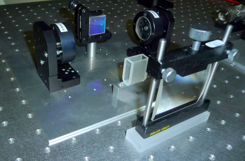 Puis le faisceau UV est dirigé sur un réseau de diffraction holographique de 2400 lignes/mm soit d=417nm, j'ai opté pour un réseau GH25-24U de la société THORLABS. Le faisceau va diffracté en 2 parties (ordre +1) et (ordre -1) avec un angle = arcsin( Lp/d), ces deux faisceaux sont réfléchit sur 2 miroirs (tuning) et dirigés vers la cuvette contenant le colorant Rhodamine 6G où il se forme des zones de pompage par addition des interférences et des zones sans pompage par destruction des interférences.