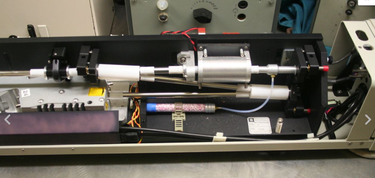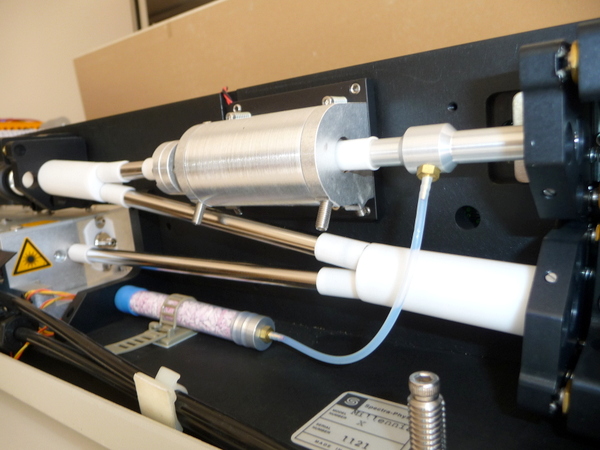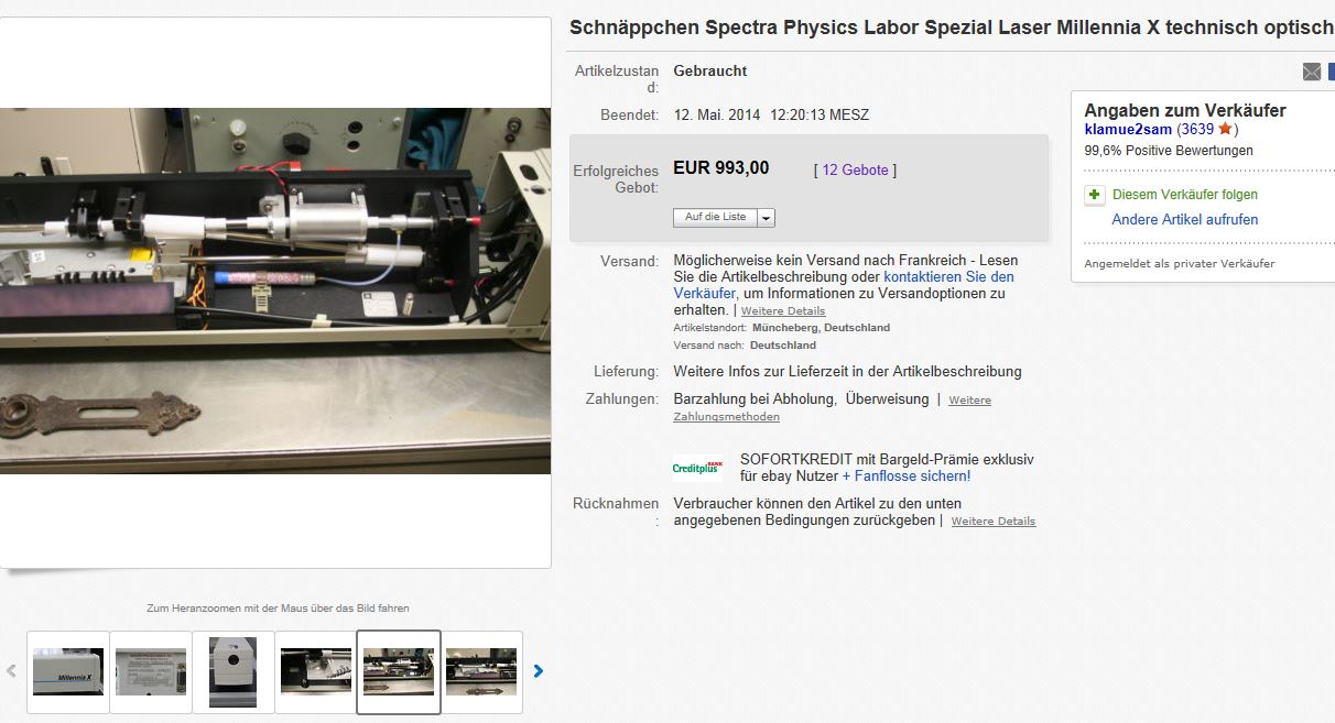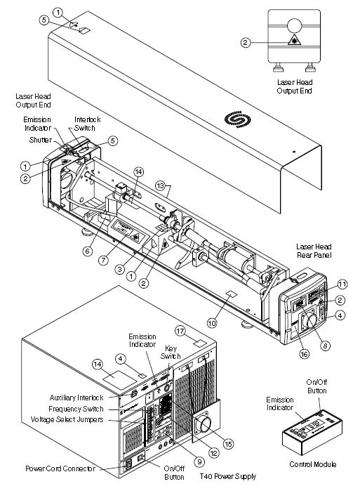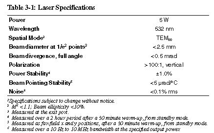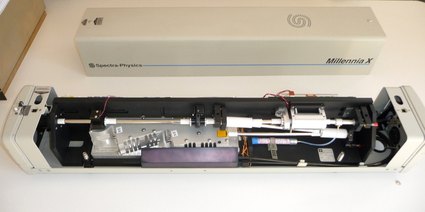 Ce laser est pompé par 2 diodes lasers de 25W contenue dans le rack 19" d'alimentation. Deux fibres optiques amène l'énergie de pompe sur la tête laser. Ce laser remplace aventageusement un laser à ion d'argon de 10W en consoment 20 fois moins d'électricité et en ayant une durée de vie 50 fois supérieur!