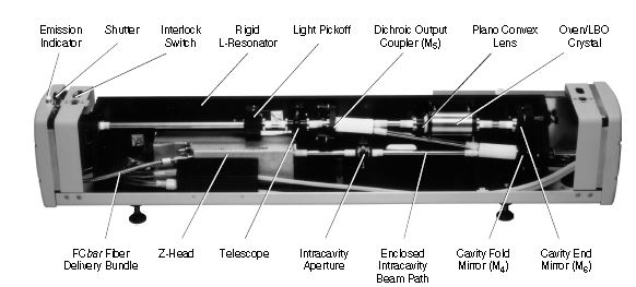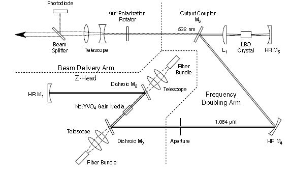L'énergie de pompage du Nd:YVO4 est amenée par 2 fibres optiques depuis l'alimentation sur laquelle sont montées les 2 diodes lasers. Ce pompage s'effectue au moyen de 2 télescopes focalisant le faisceau pompe par les 2 faces opposées du cristal. Le résonateur se compose d'un miroir M1 HR de 2 miroirs dichroics M2 et M3, d'un diaphragme, d'un miroir M4 HR concave, d'un miroir M5 de sortie HR 1064nm et OC 95% 532nm, d'une lentille de focalisation L1 permettant de focalisé l'énergie de pompe dans le cristal doubleur LBO et du miroir M6 HR 1064 et HR 532nm.