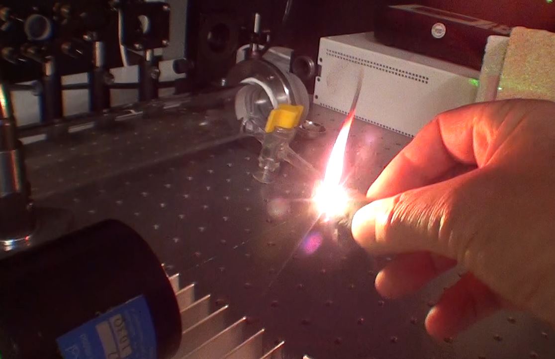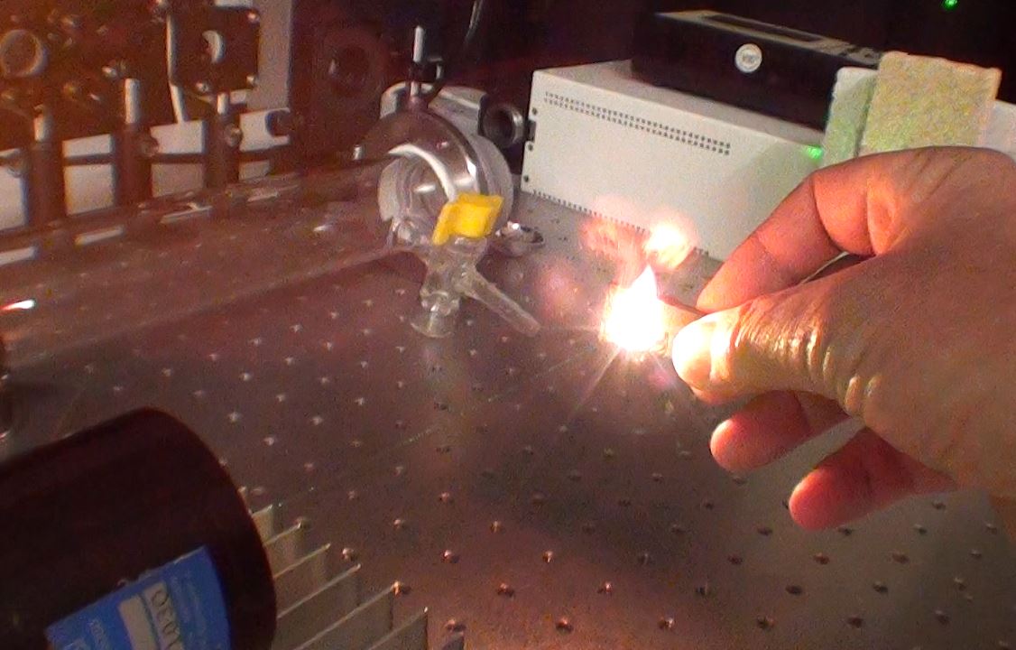 L'énergie de pompage arrive par 2 fibres optique munies d'un télescope permettant de focalisé l'énergie pompe dans le cristal. Dans le résonateur optique se trouve également deux Q-switch permettant d'obtenir des impulsions géantes nécessaire pour le doublage et le triplage de fréquence.