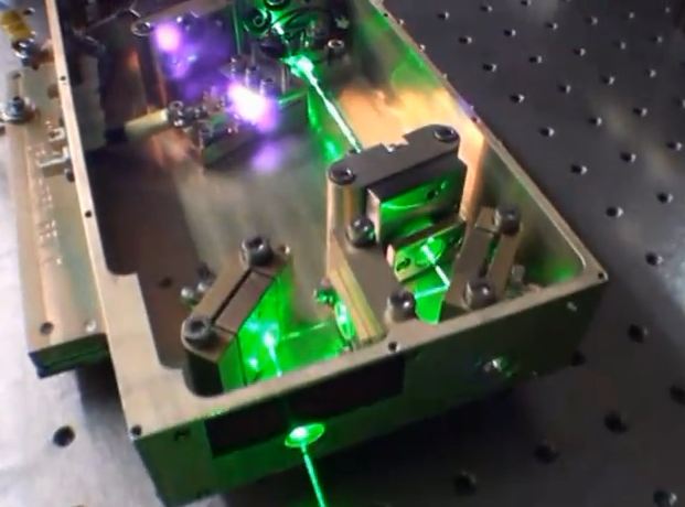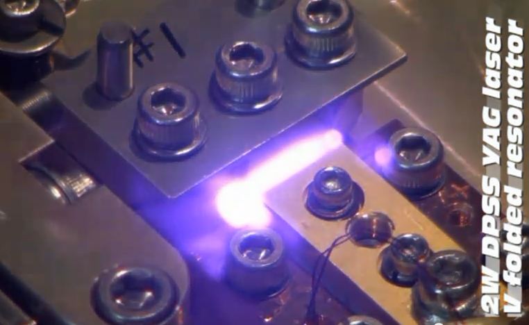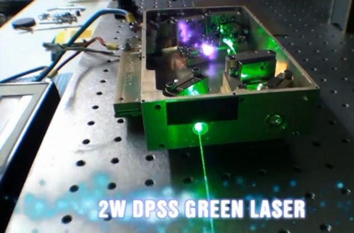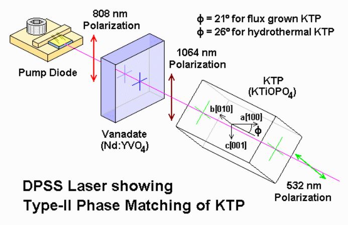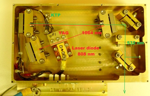 Ce laser se compose d'un cristal Nd:YAG de 3x3x10 mm qui est pompé par une diode laser COHERENT® de 20 W cw. La diode et le Nd:YAG sont montés sur un support de cuivre lui-même monté sur un TEC pour refroidir le YAG et maintenir une température constante de la diode pour que celle-ci émette sur la longueur d'onde d'absorption du YAG. Le cristal doubleur de fréquence est un KTP lui même monté sur un bloc de cuivre muni d'un corps de chauffe résistif permettant l'accord de phase. Il n'y a pas de q-switch intra-cavité