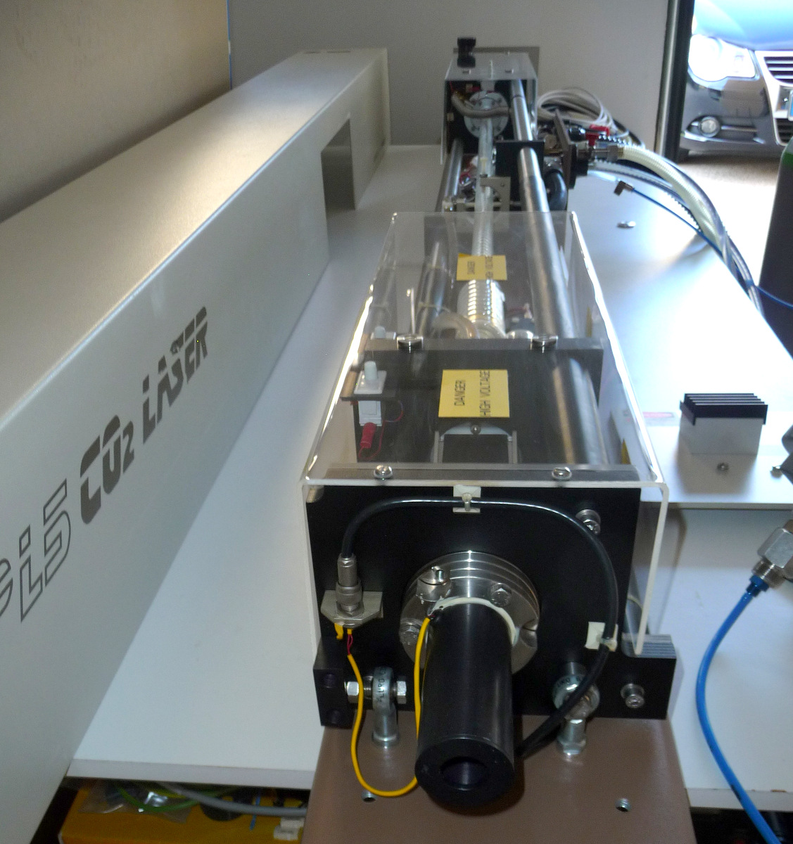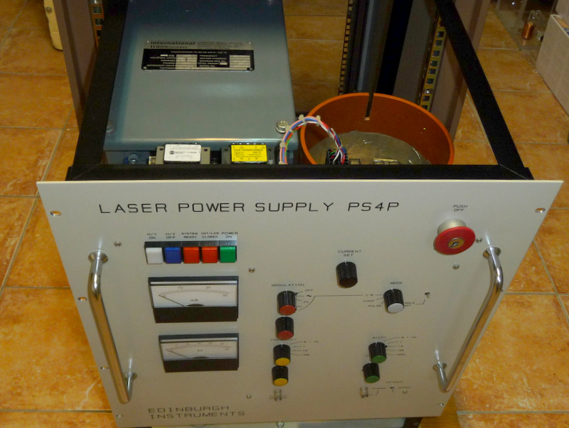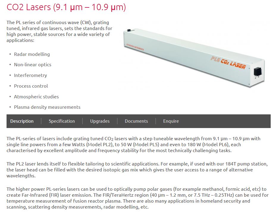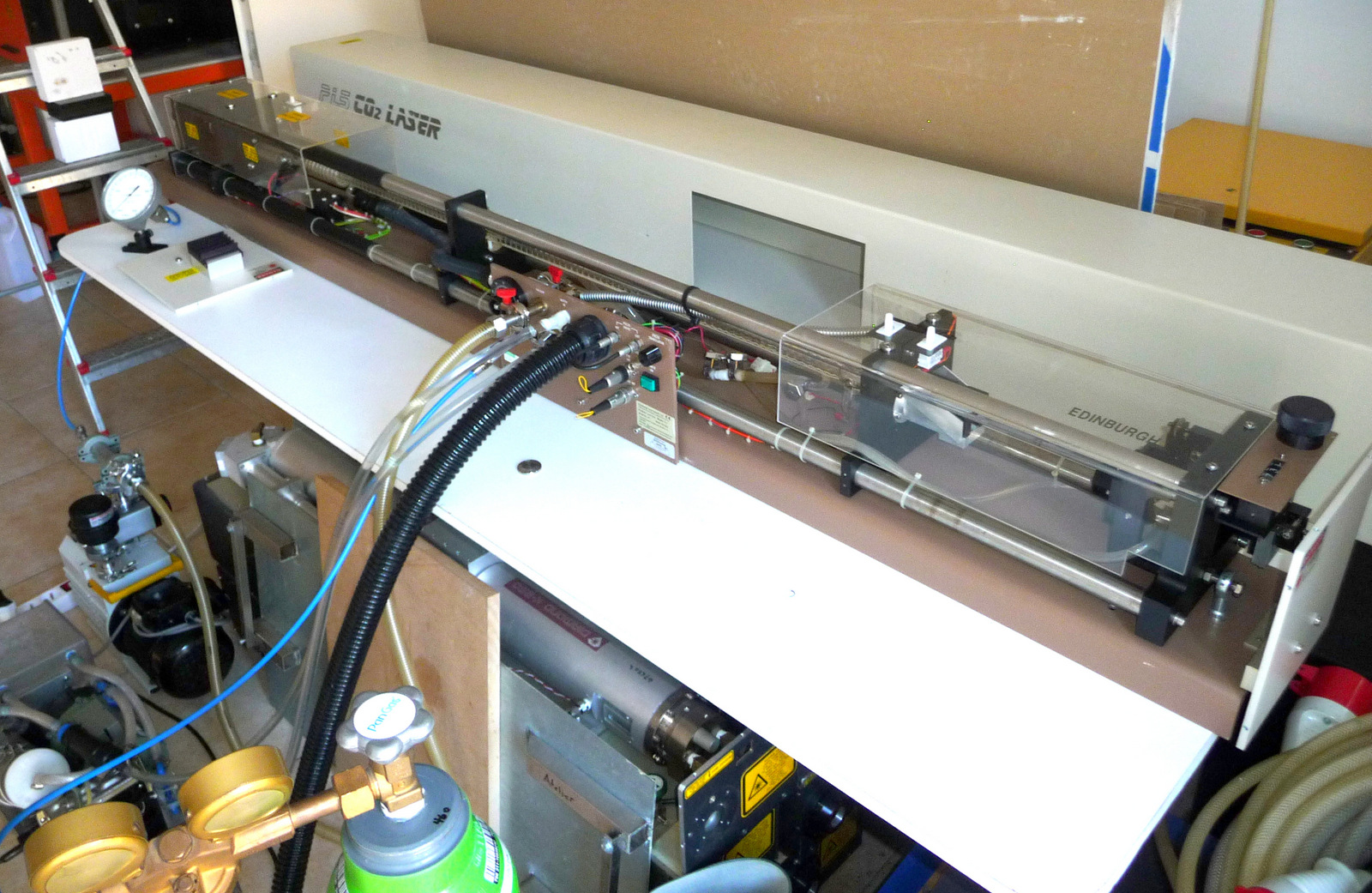 Ce laser à gaz carbonique de plus de 50W peut travailler en régime continu ou pulsé. Il est muni d'un réseau de diffraction (grating) permettant de choisir parmis 80 raies d'émission entre 9.1 et 10.9 micron. Il travail en régime monomode TEM00 et est muni d'un miroir de sortie monté sur un actuateur piezo-électrique permettant de stabiliser la longueur de la cavité au moyen d'un générateur "Laser Frequency Stabiliser" Model 209. Avec cette option la stabilité de fréquence est de 100kHz (opto-galvanique Lamb-dip). Le faisceau fait 7.5mm de diamètre avec une divergence de 3.5mrad et est polarisé vertical. Le tube de décharge est muni à chaque extrémité de fenêtres en ZnSe à l'incidence de Brewster et le tube de décharge est ondulé de manière à éviter de produire des modes transverses autre que le TEM00 ! En régime pulsé il peut travailler de 1Hz à 1kHz avec des pulses carrés, triangulaires et sinusoidaux grâce à une triode HT. Il est également possible de travailler en Q-switching avec une cellule SF6 permettant d'obtenir des pulse de 200ns ! Ce laser peut également servir à pomper optiquement des gaz polaires comme le méthanol, l'acide formique, etc.. pour obtenir un laser FIR(Far IfraRed) émission de 40 micron à 1.2mm ( 7.5THz-0.25THz).