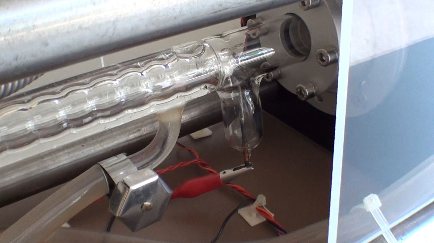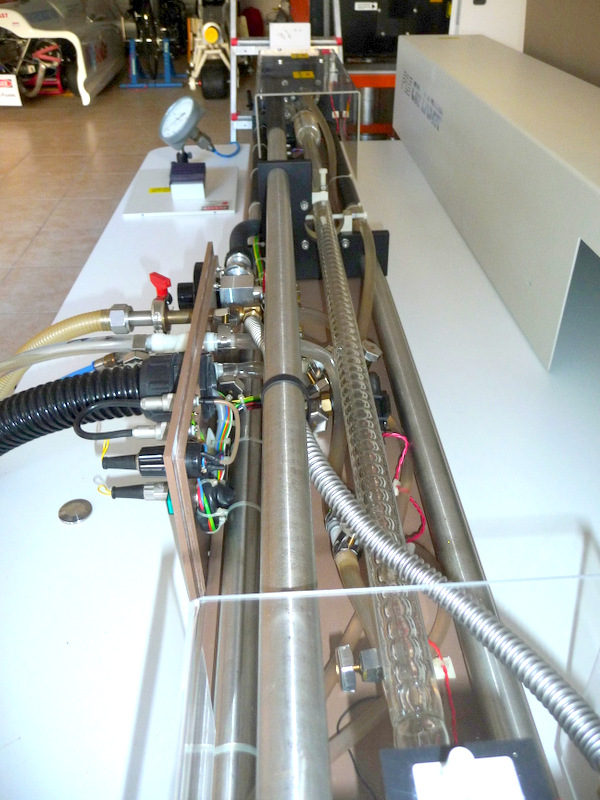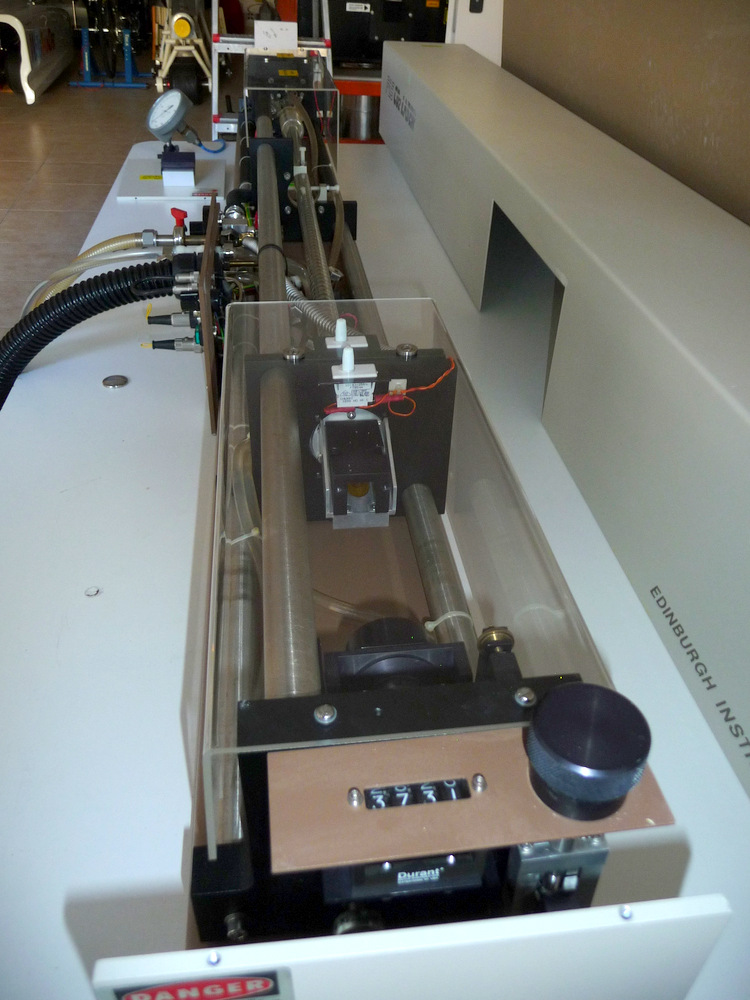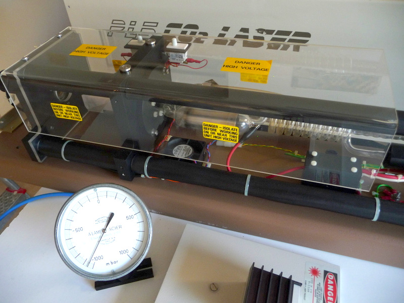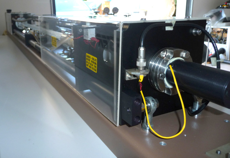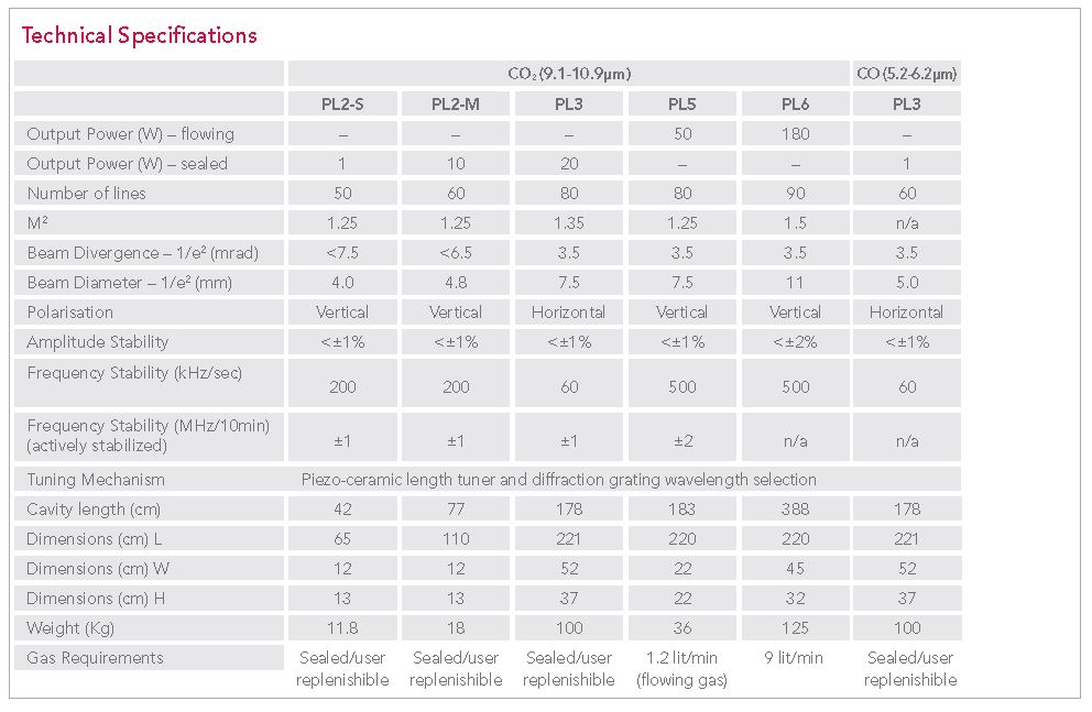Ce laser à gaz carbonique de plus de 50W peut travailler en régime continu ou pulsé. Il est muni d'un réseau de diffraction (grating) permettant de choisir parmis 80 raies d'émission entre 9.1 et 10.9 micron. Il travail en régime monomode TEM00 et est muni d'un miroir de sortie monté sur un actuateur piezo-électrique permettant de stabiliser la longueur de la cavité au moyen d'un générateur "Laser Frequency Stabiliser" Model 209. Avec cette option la stabilité de fréquence est de 100kHz (opto-galvanique Lamb-dip). Le faisceau fait 7.5mm de diamètre avec une divergence de 3.5mrad et est polarisé vertical. Le tube de décharge est muni à chaque extrémité de fenêtres en ZnSe à l'incidence de Brewster et le tube de décharge est ondulé de manière à éviter de produire des modes transverses autre que le TEM00 ! En régime pulsé il peut travailler de 1Hz à 1kHz avec des pulses carrés, triangulaires et sinusoidaux grâce à une triode HT. Il est également possible de travailler en Q-switching avec une cellule SF6 permettant d'obtenir des pulse de 200ns ! Ce laser peut également servir à pomper optiquement des gaz polaires comme le méthanol, l'acide formique, etc.. pour obtenir un laser FIR(Far IfraRed) émission de 40 micron à 1.2mm ( 7.5THz-0.25THz).