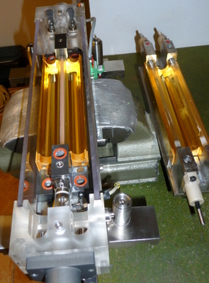 Cette tête laser est prévue d'être utilisée pour réaliser un laser doublé à 532nm de 300W de sortie. Il me faudra encore réaliser une alimentation de 20kW pour faire fonctionner les 2 tubes à krypton.
