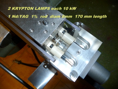 voilà je viens de démarrerla construction d'un YAG pompé par 2 tubes Krypton de 10 kW chacun soit 20 kW pompe sur un barreau Nd:YAG de 170 mm x 8 mm sortant déjà plus de 650W cw