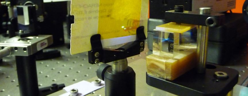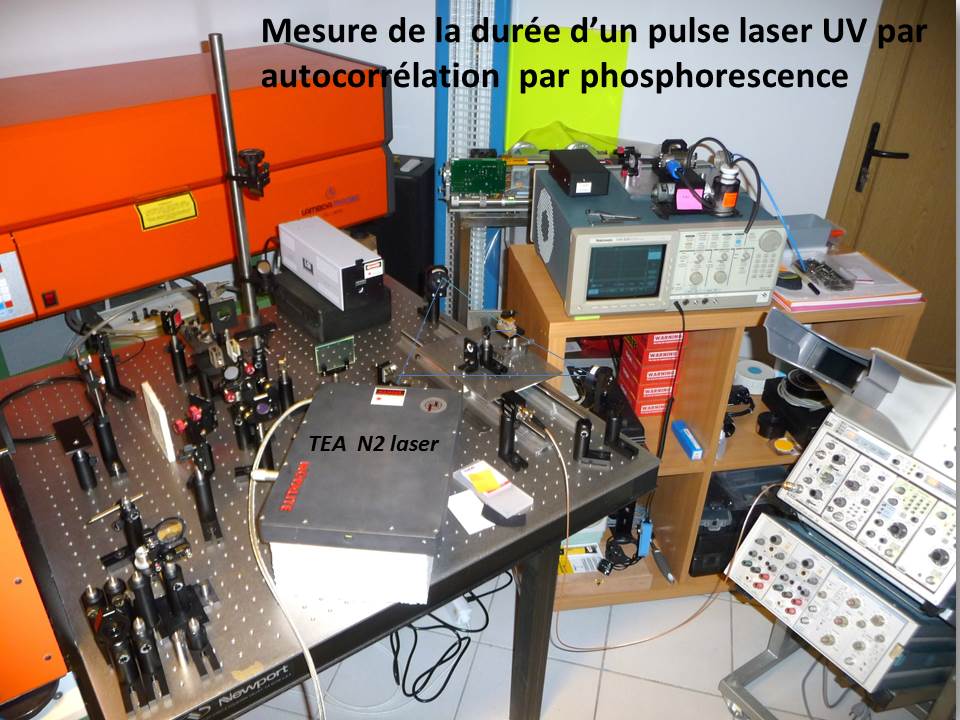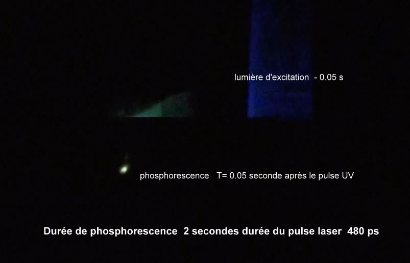 Cette expérience est une première car en faisant une recherche bibliographique je n'ai trouvé aucune publication ou document relatant ce genre de mesure. Ici le détecteur est un morceau de scotch plastique servant à l'isolation électrique que j'utilisais en 1982 quand j'ai commercialisé mes lasers MOPALITE. A l'époque j'avais constaté, qu'a partir d'un certain seuil d'intensité lumineuse, le scotch phosphorait durant environ 2 secondes à l'endroit où l'intensité était la plus élevée. Je me suis dit qu'il devait y avoir un effet d'absorption et de ré-émission non linéaire qui permettrait par auto-corrélation intensimétrique de mesurer la durée d'un pulse laser UV. En faisant la mesure par translation du scotch sur le chariot mobile j'obtiens la phosphorescence sur un déplacement de 70mm ce qui correspond à 460ps de durée de pulse.