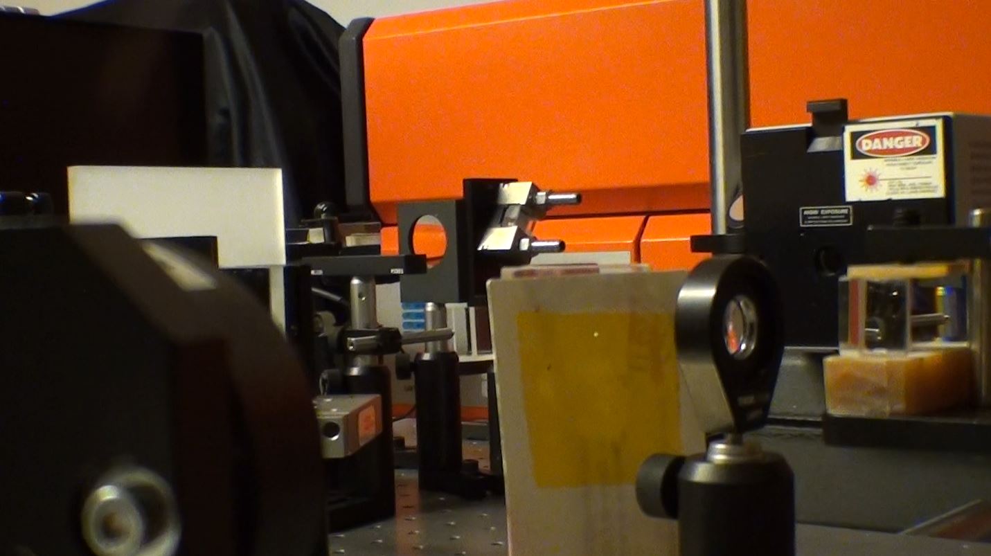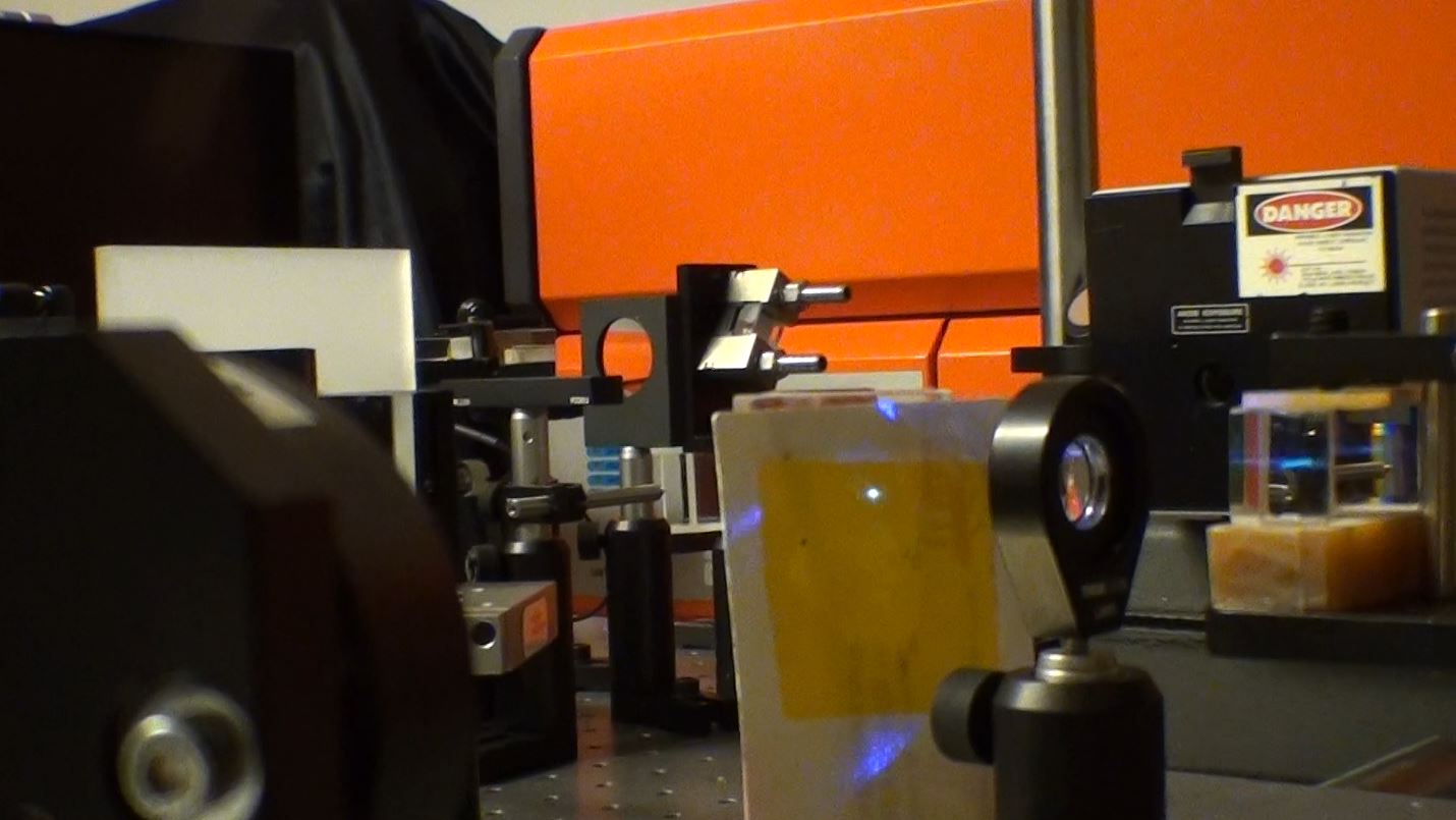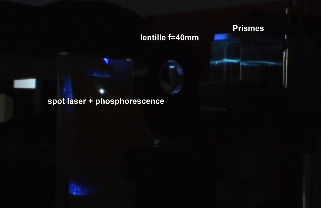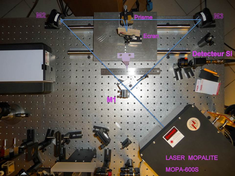 Le laser MOPALITE MOPA-600 produit des pulses de 600kW durant 500 picosecondes. Le faisceau est divisé en 2 faisceaux contre propageant de même intensité ( 300kW chacun). Deux prismes renvoie les 2 faisceaux qui se superposent sur un écran en plastique contenant une substance capable de phosphorescer