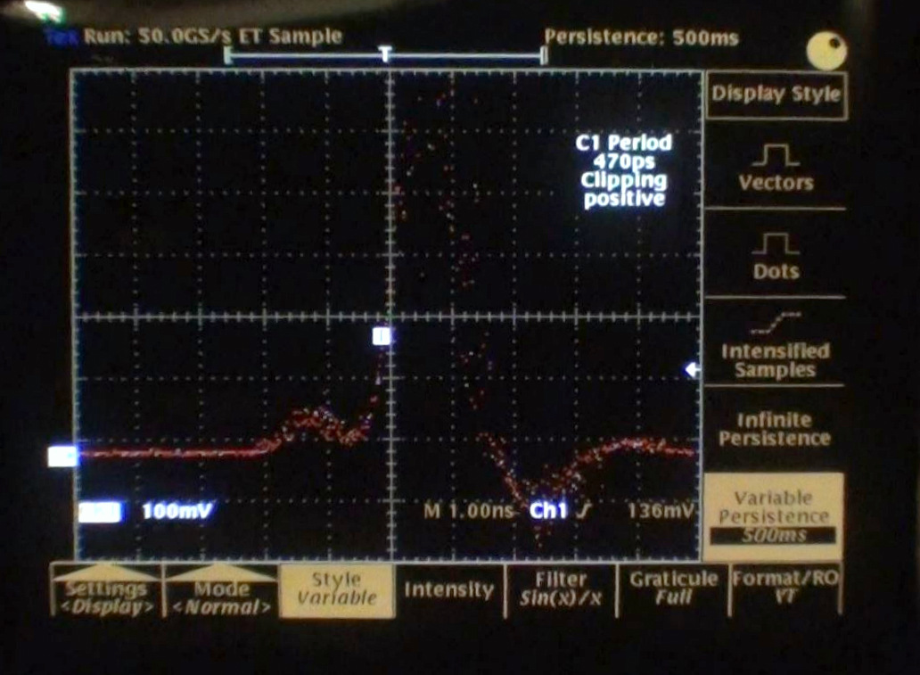 Sur l'oscilloscope la durée à mi-hauteur est de 470ps ! Le plus étonnant c'est de pouvoir déterminer une durée de pulse laser dans l'échelle des picosecondes avec un détecteur ayant un temps de réponse dans le domaine de la seconde !
