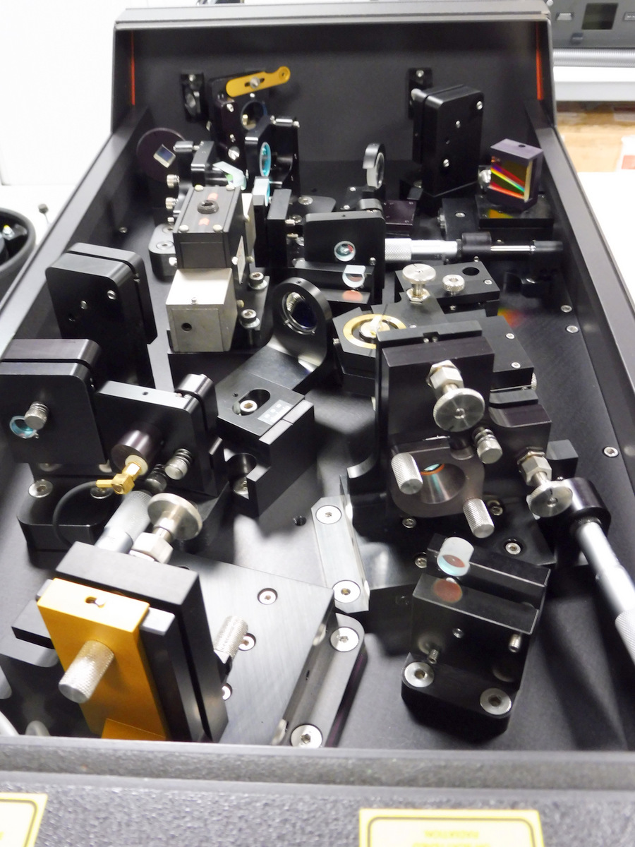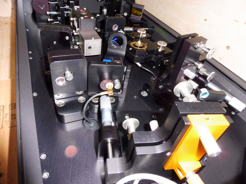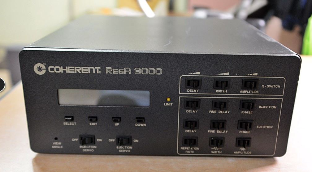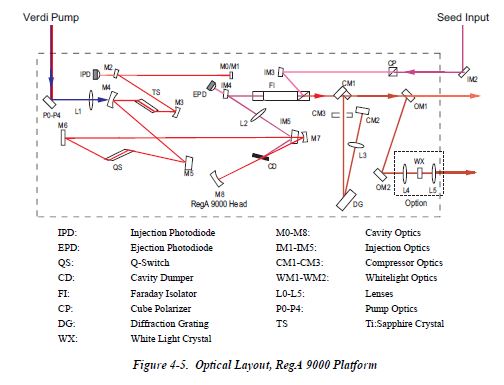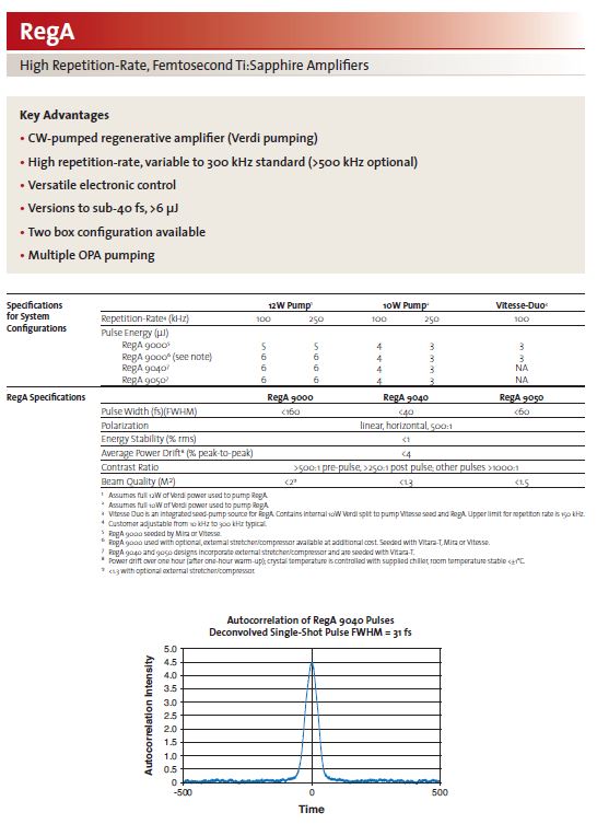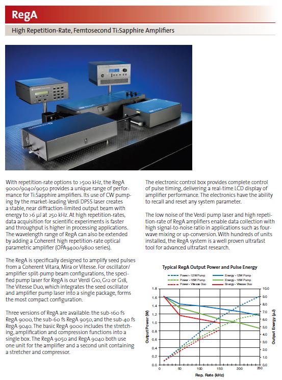 PAGE EN CONSTRUCTION LeRegA9000 est un amplificateur régénératif pompé par un laser continu de 12W @ 532nm. Il permet d'amplifier par un facteur 1000 l'énergie d'un Laser MIRA900. Le RegA9000 se compose d'un cristal Ti:S ainsi que d'un étireur et compresseur ainsi que d'un module de génération de lumière blanche. L'intensité de sortie est de 33MW @ 800nm durant 150fs à 250 kHz soit 1.5W moyen (6 micro-joules/pulse). Il y a également une sortie en lumière blanche ! Un module électronique permet de synchronisé la cellule de Pockel avec le faisceau venant du MIRA900 ainsi que de changer la fréquence de répétition.