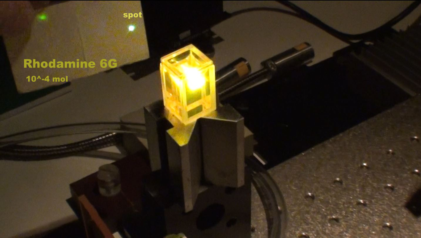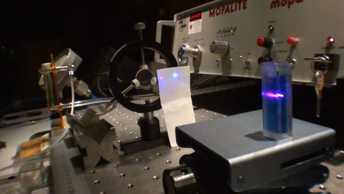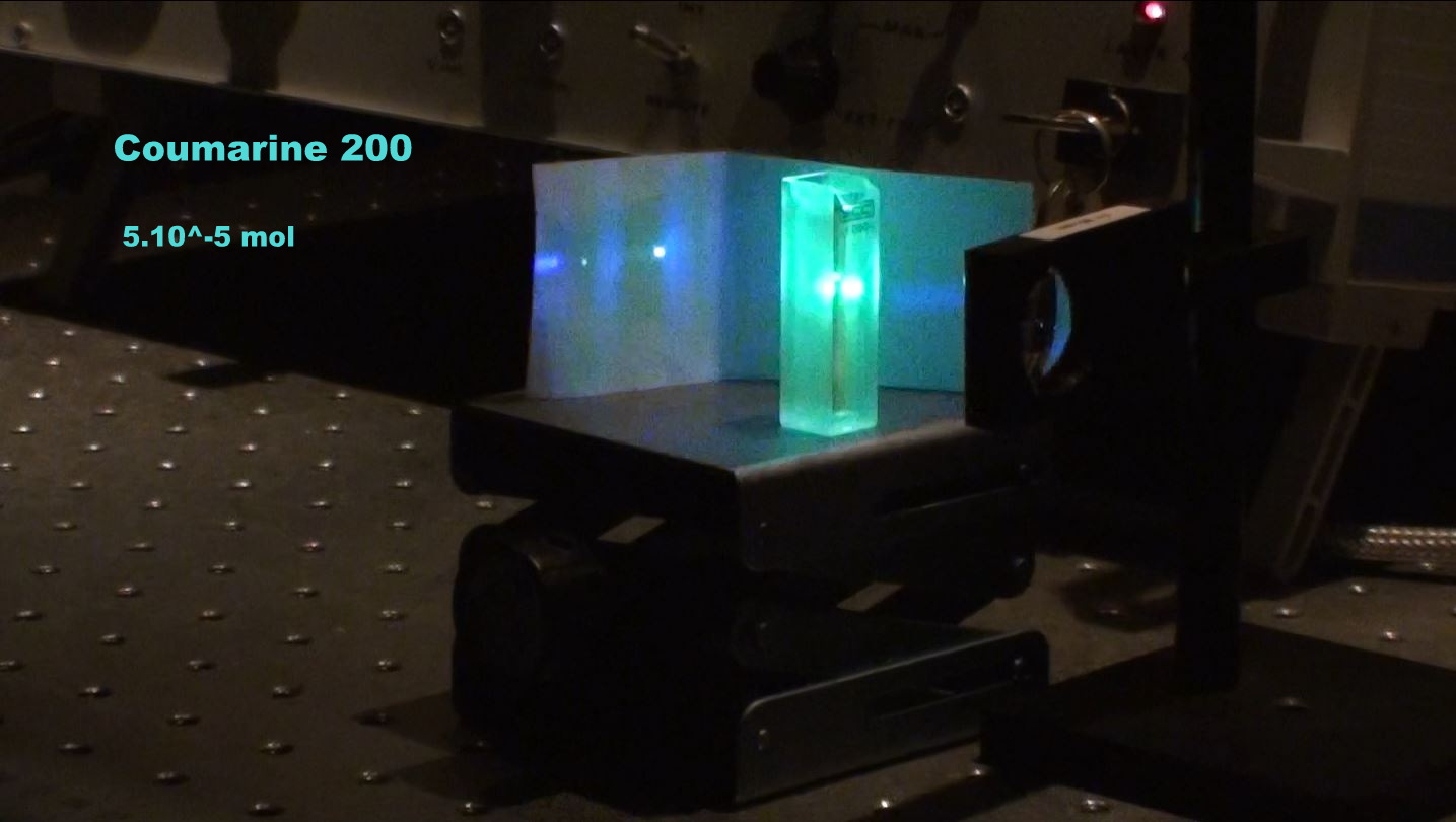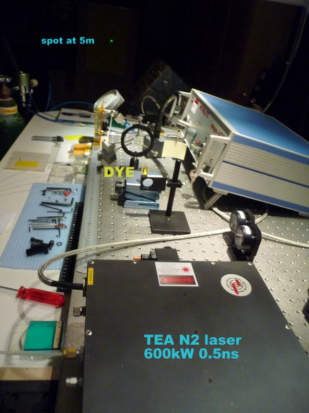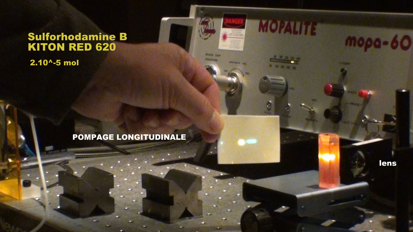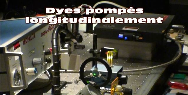 Laser à colorant pompé longitudinallement par un laser TEA N2 MOPALITE MOPA600S de 600kW en 500ps. Avec ce laser limite de diffraction il est très facile de faire du pompage longitudinal avec une lentille de 50-100mm de focale.