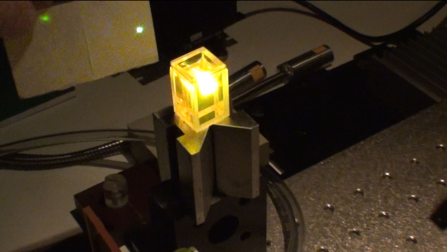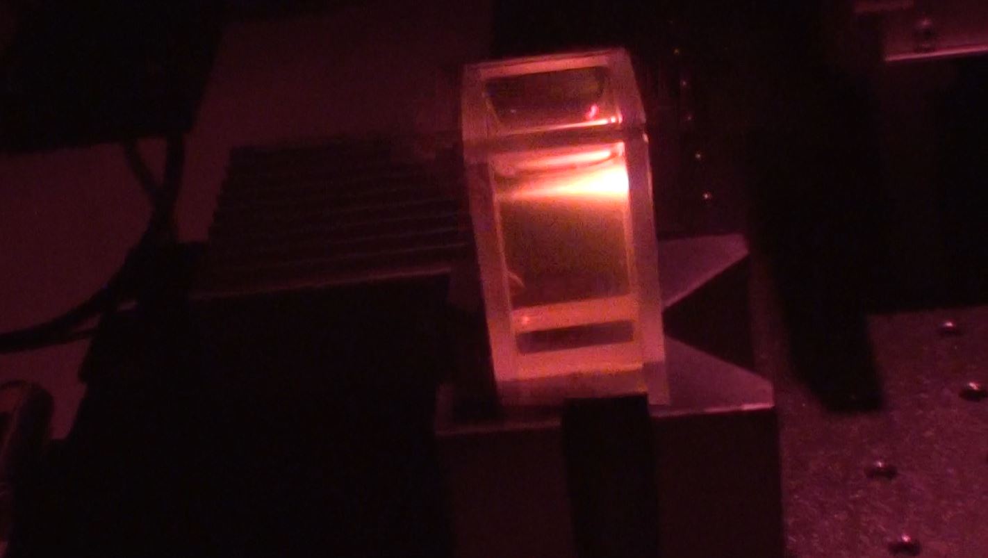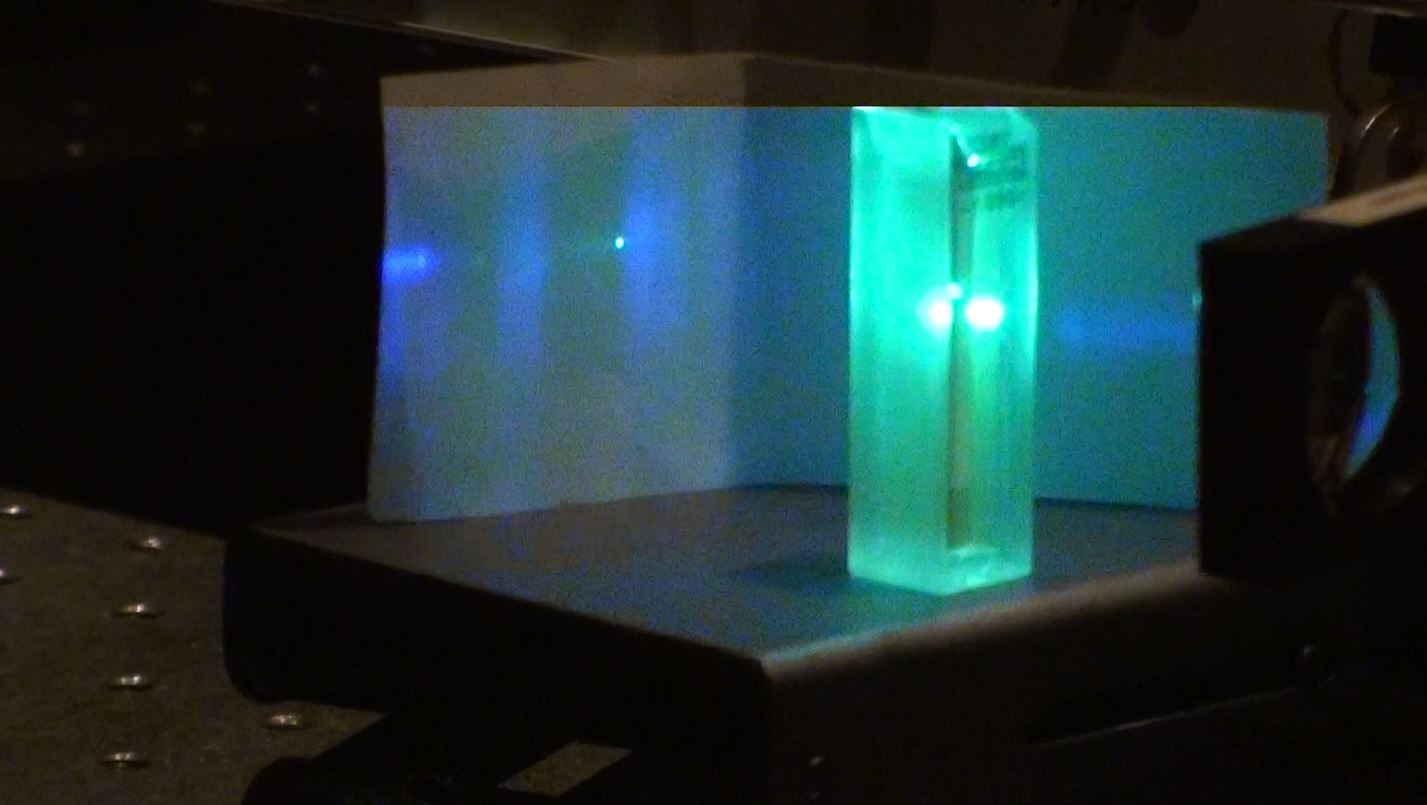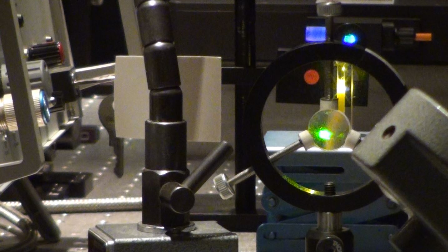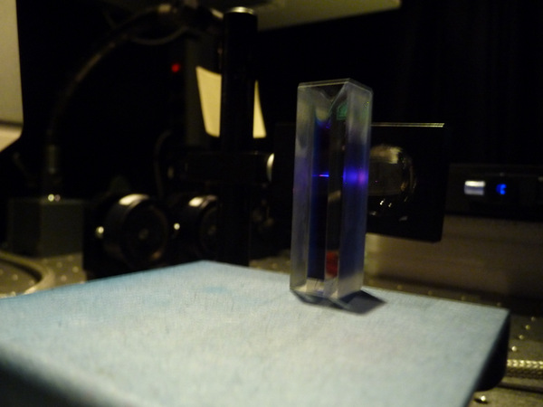 Laser à colorant pompé longitudinallement par un laser TEA N2 MOPALITE MOPA600S de 600kW en 500ps. Avec ce laser limite de diffraction il est très facile de faire du pompage longitudinal avec une lentille de 50-100mm de focale.