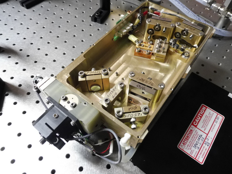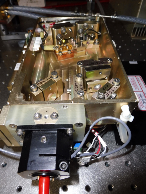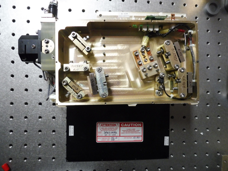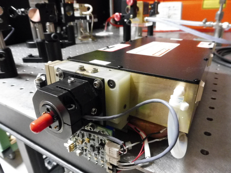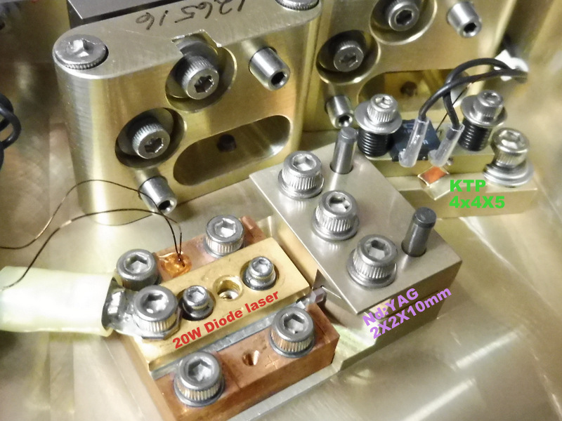Laser ultra-compact DPSS doublé en fréquence au moyen d'un cristal KTP muni d'une résistance chauffante avec un capteur de température pour réalisé l'accord de phase.