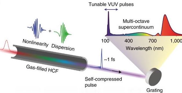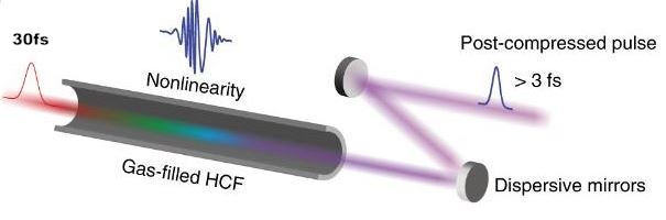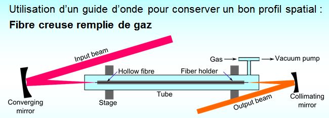 Le principe est la formation de solitons de haute énergie dans les fibres à capillaires creuses remplie de gaz rares provoque une altération extrême de la forme temporelle et spectral d'une impulsion lumineuse qui se propage dans la fibre.