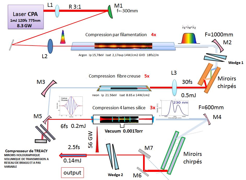Une troisième compression utilisant des lames de silice de 0,5 mm d'épaisseur. Une enceinte en verre de 50 mm de diamètre intérieur avec 4 lames de silice de 0,5 mm d'épaisseur situées près du foyer optique et espacées d'environ 8 cm entre chaque lames. Le miroir argenté M5, d'une longueur focale de 600 mm, concentre le faisceau sur les lames. Le miroir M4 d'une longueur focale de 600 mm redresse le faisceau pour le rendre parallèle, puis il est envoyé vers une dernière paire de miroirs chirpés pour former une impulsion de lumière monocycle de 2.5fs !