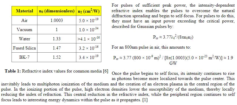 | Dans la filamentation différents phénomène physique se produisent de la diffraction, dispersion de la vitesse de groupe, auto-focalisant par effet Kerr, auto-raidissement de l'impulsion, focalisation spatio-temporelle, diffusion Raman, ionisation, défocalisation du plasma ainsi que la photo-absorption et la recombinaison du plasma.
