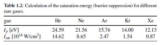 | Ici on peut voir l'intensité laser en W/cm2 que l'on peut introduire dans la fibre creuse avec les différents gaz avant d'obtenir la ionisation de ceux-ci.