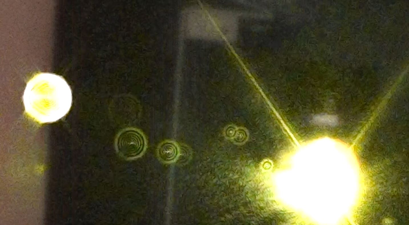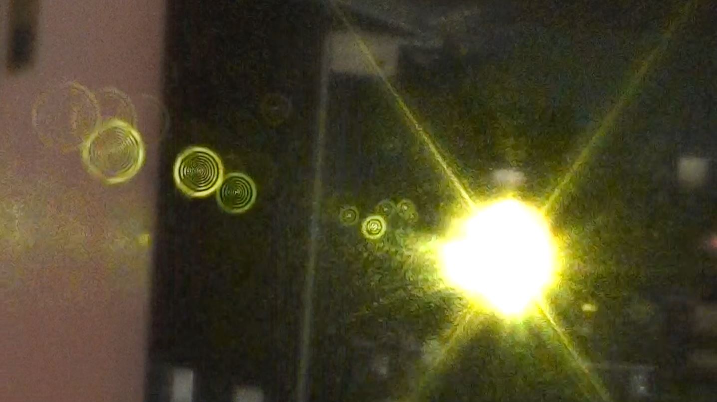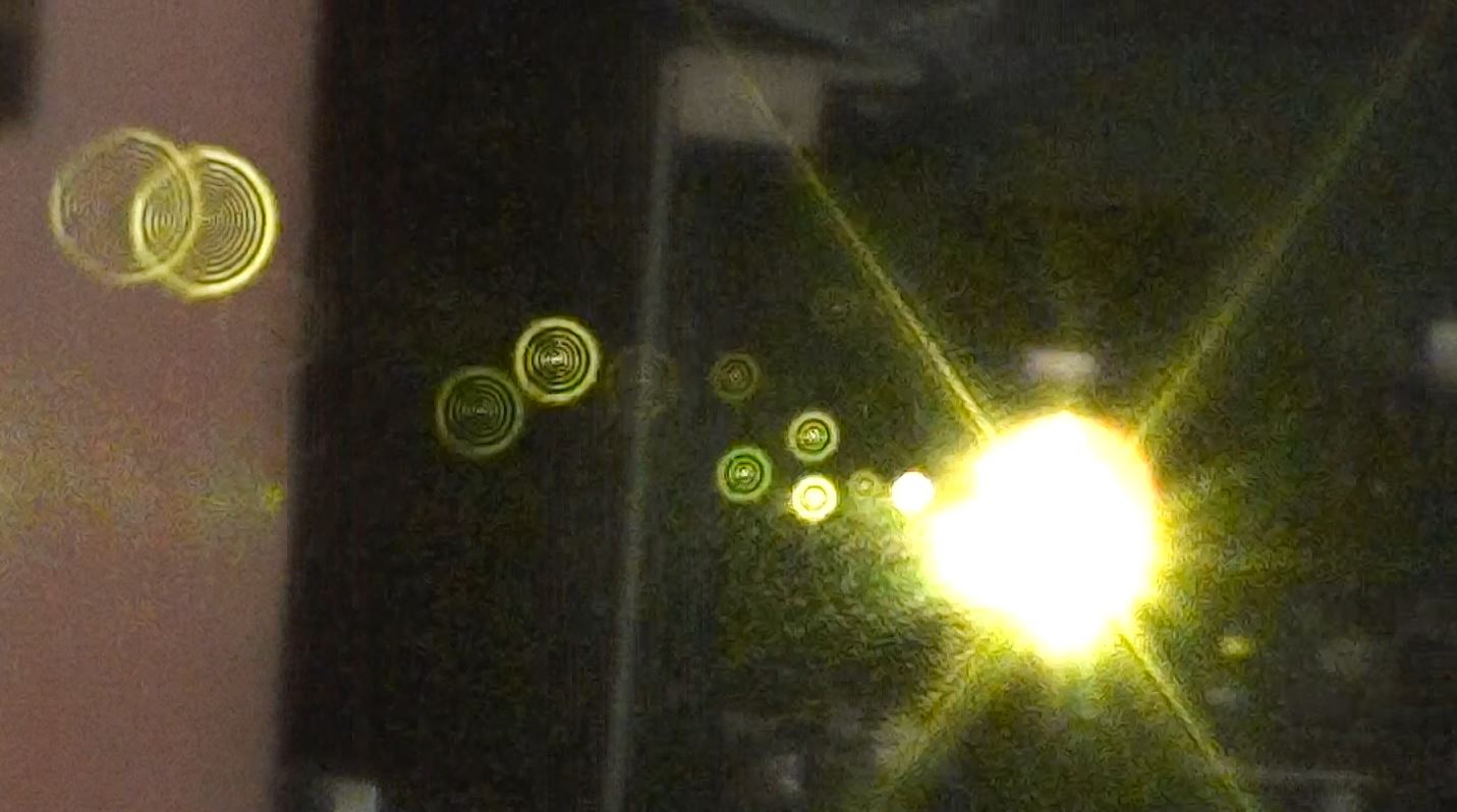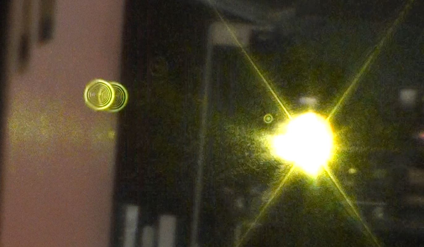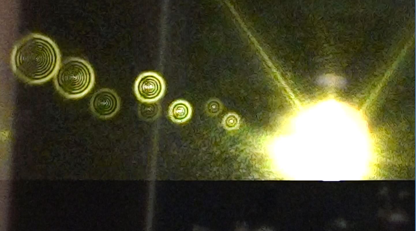 Pour les prises de vue j'ai ma caméra vidéo placée à 9 mètres de la sortie du laser et je vise la sortie du laser décalé de 5 cm. Chaque poussière dans l'air produit une diffraction en forme d'anneaux concentrique que la caméra capte grace à une durée de pulse très courte (300ps) et une forte intensité. Ci-dessous quelques capture d'images et une petite vidéo !