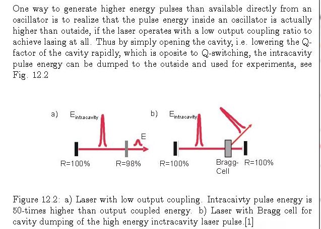 Ceci peut être réalisé avec différentes méthodes agissant à l'intérieur ou à l'extérieur de la cavité laser. Le Cavity Dumper Kit, par exemple, est bien adapté à la sélection d'impulsions de lasers à modes verrouillés avec des taux de répétition compris entre 50 MHz et 85 MHz à l'intérieur de la cavité laser. L'énergie d'impulsion augmente par rapport à un simple fonctionnement à blocage de mode en même temps. La fonction est basée sur l'effet acousto-optique. Dans un cristal approprié (par exemple de la silice fondue), une modulation de l'intensité et donc un indice de réfraction sont introduits par l'application d'un signal acoustique à haute fréquence. Un "cavité dumpe" étend la possibilité d'utilisation d'un système laser à verrouillage de mode en offrant une puissance de crête plus élevée à des taux de répétition plus faibles.