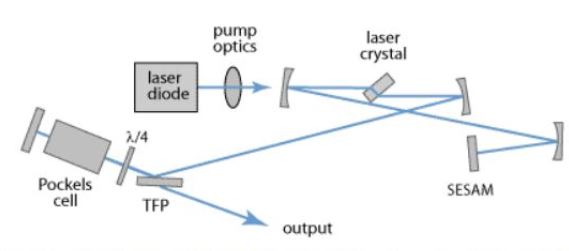 Ce laser se compose d'un cristal Yb:YAG pompé par une diode laser de 3W monomode type COHERENT S-81-3000-200. La cavité contient une lame polarisante, 5 miroirs avec compensation du GVD et une cellule de Pockel ultra-rapide pour extraire l'énergie de la cavité. Se laser est un oscillateur muni d'un "cavity dumper" ce qui permet d'extraire une énergie de 100 à 1000 fois plus qu'un oscillateur simple. .