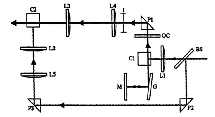 Le laser pompe est le laser PRA LN1000 de 2 Mégawatts et 500 ps de durée de pulse. Ce laser LN107 se compose d'une cuvette de colorant travaillant comme oscillateur avec un réseau de diffraction et d'un miroir qui peut pivoter sur son axe de manière à changer la fréquence d'émission sur la largeur de la bande de fluorescence du colorant contenu dans la cuvette. Le faisceau pompe arrive à droite et est divisé en un faisceau contenant 40% de l'énergie pompe qui est focalisé au moyen d'une lentille plan-cylindrique sur la cuvette "oscillateur" et les autres 60% sont dirigé sur la cuvette "amplificateur" par 2 prismes et une lentille plan-convex et une lentille cylindrique bi-convex. Cette lentille cylindrique bi-convex est montée sur un support orientable permettant d'optimiser au mieux le pompage de l'amplificateur. Les cuvettes en quartz SUPRASIL son inclinée d'une dizaine de degrés pour éviter que le laser se mette à osciller de façon incontrolée.