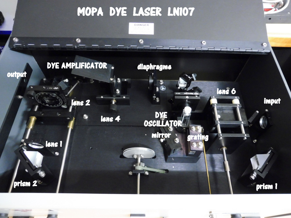 Ce laser produit par LASER PHOTONICS est la version du laser à colorant LN107 qui fut produit par PRA Inc. Canada. LASER PHOTONICS à rajouté un amplificateur pour augmenter l'énergie de sortie. MOPA = Master Oscillator Power Amplifier.
