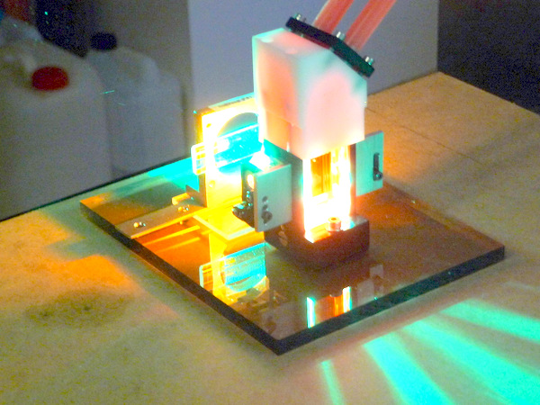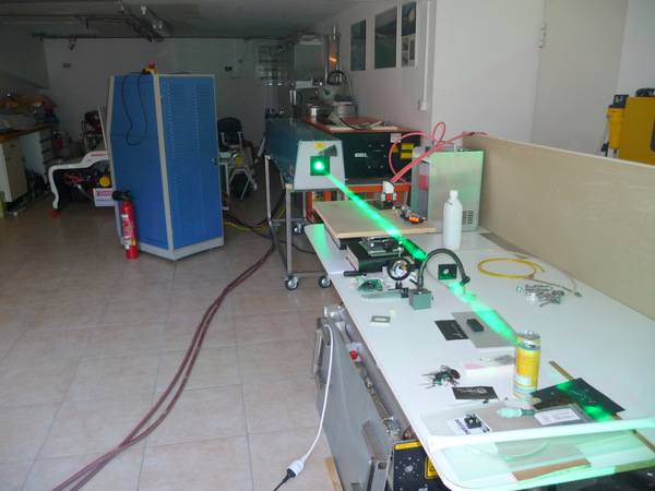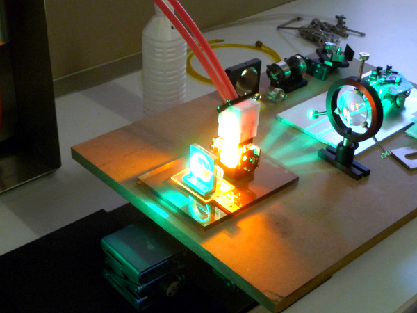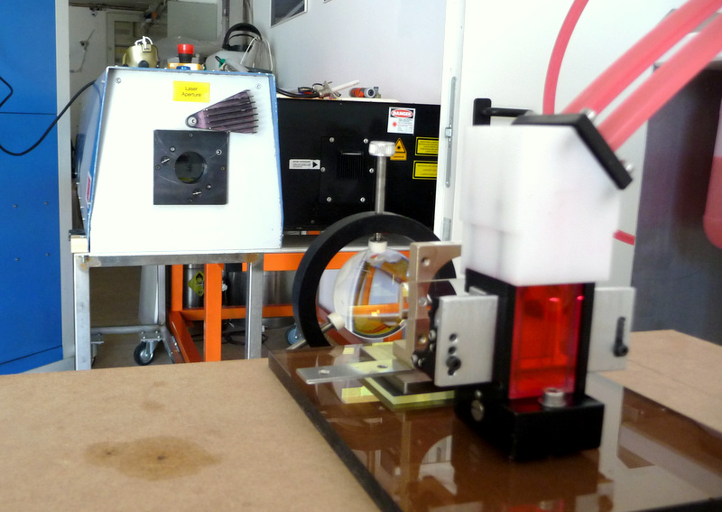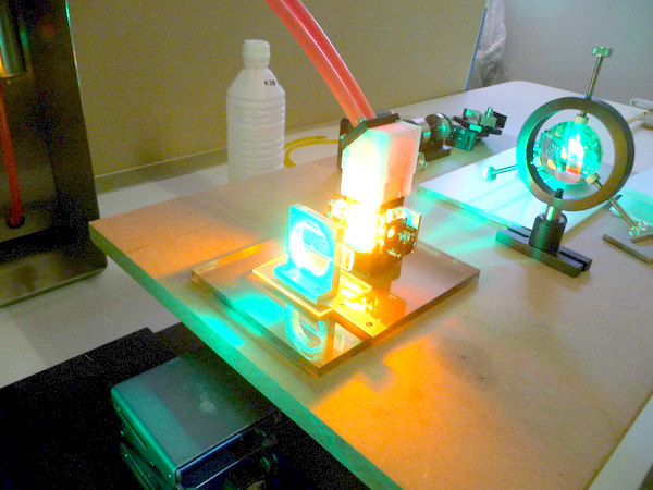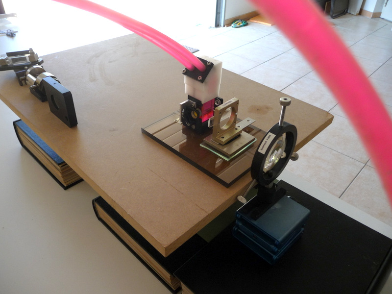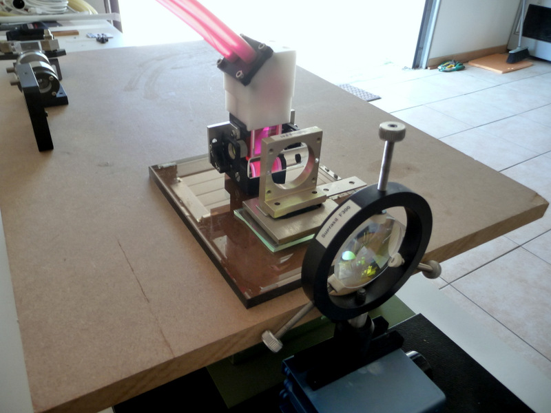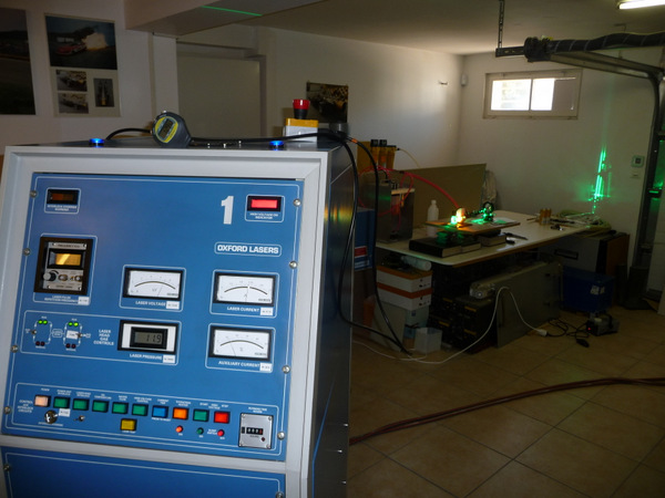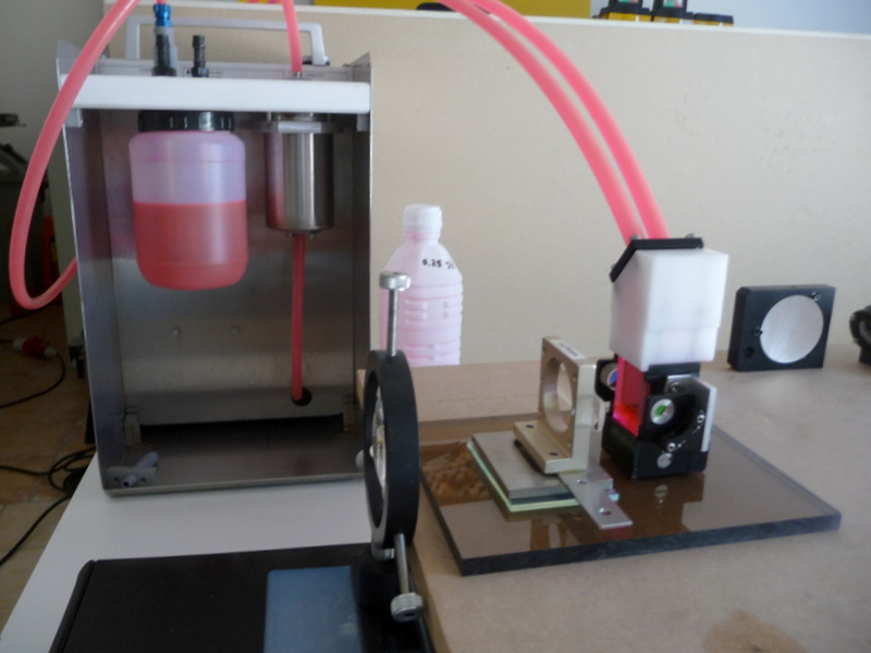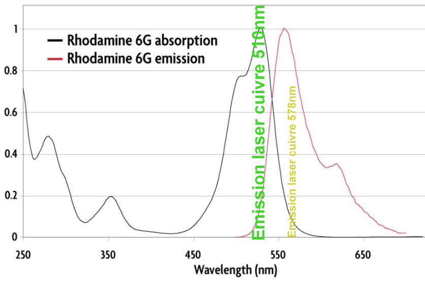 Laser à colorant pompé par un laser à vapeur de cuivre à 7 kHz La Rhodamine 6G n'a pas donné d'effet laser probablement par le fait d'une dépopulation du niveau excité de la Rh6G par l'émission de la raie jaune ((578nm). Comme le laser à vapeur de cuivre émet sur 2 raies 510 et 578nm, la raie 510nm pompe le colorant et en même temps la raie 578 dépeuple l'état excité dans la direction du faisceau pompe et donc pas d'émission transversale. Il faudra mettre un filtre à la sortie du laser pompe qu'il bloque le 578nm ou changer par un colorant qui ne présente pas de raie démission dans les 2 raies du laser pompe !