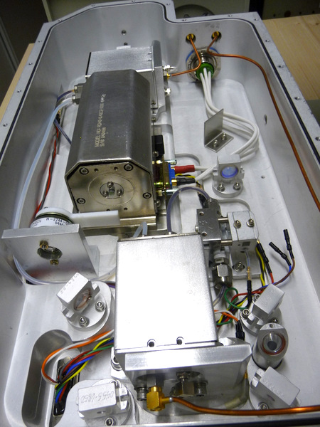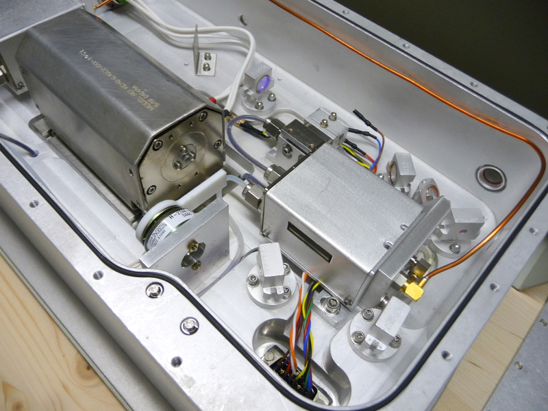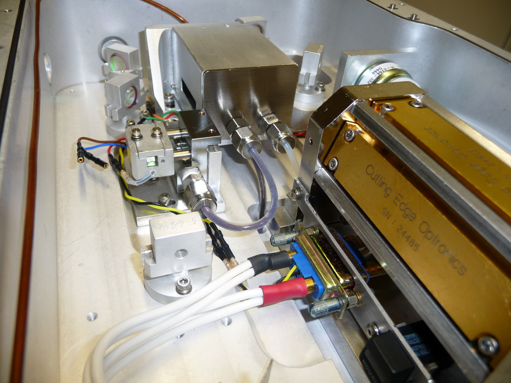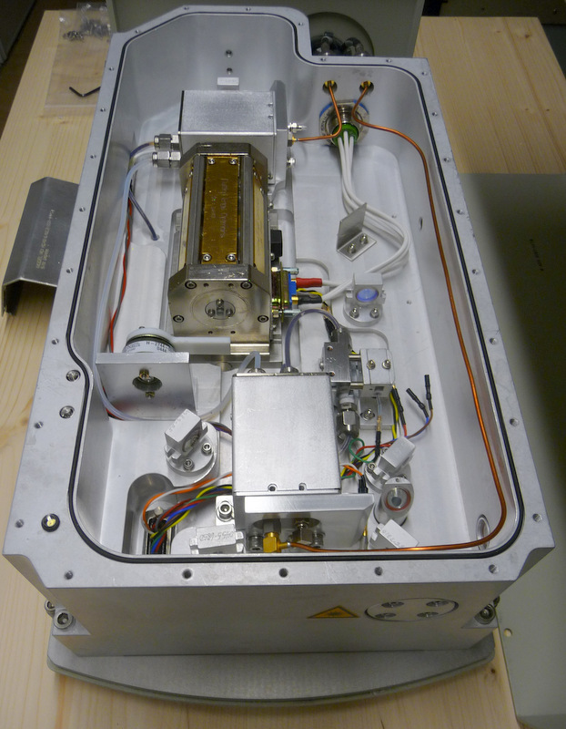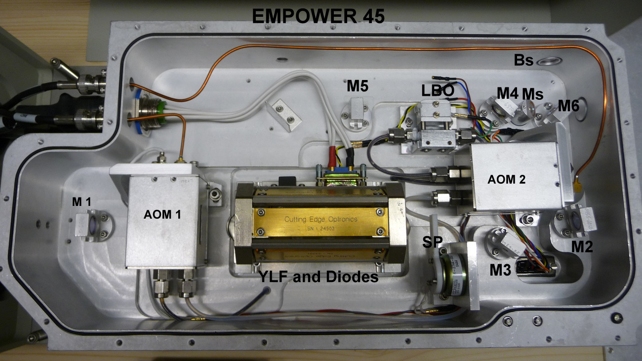 La tête laser se compose d'un barreau YLF dopé au néodyme de 5mm de diamètre et 100mm de long pompé par 6 barrettes de diodes de 160W cw (Cutting Edge Optronics) de NORTHROP GRUMMAN. Le cristal doubleur de fréquence est du type intra-cavité, la cavité étant formée du miroir M1 Rmax 99.8% @ 1.047 et du miroir M5 Rmax 99.5% @ 1.047 et Rmax 99.95% @ 527nm. Le miroir de sortie Rs = 96% se trouve directement déposé sur le cristal doubleur LBO l'autre coté du LBO est taillé à l'incidence de Brewster. Les miroirs M2 et M3 sont Rmax @ 1.047 et servent uniquement à renvoyer la sortie du faisceau dans le modulateur acousto-optique AOM2 qui est taillé aux 2 faces à l'incidence de Brewster. Le miroir M4 à 45° est Rmax @ 1.047 et AR/AR @ 527nm. La lame MS prélève 0.01% de la lumière doublée pour la régulation du laser. SP est un obturateur intra-cavité servant à stoper l'émission laser. AOM1 est un modulateur acousto-optique servant de Q-switching transformant le faisceau continu en un faisceau pulsé dont la durée des pulses est de 150ns à un taux de répétition de 1Hz à 10kHz.