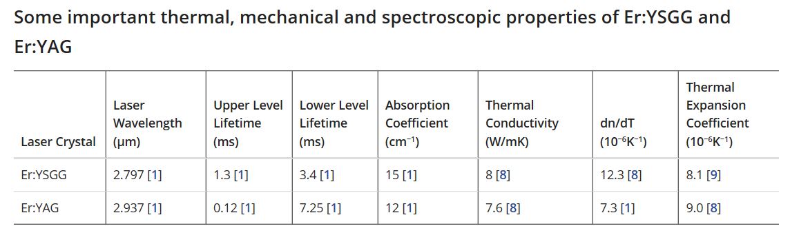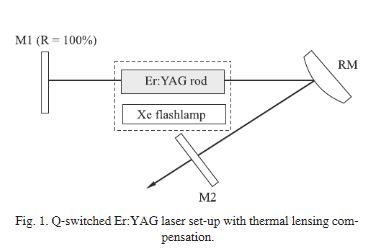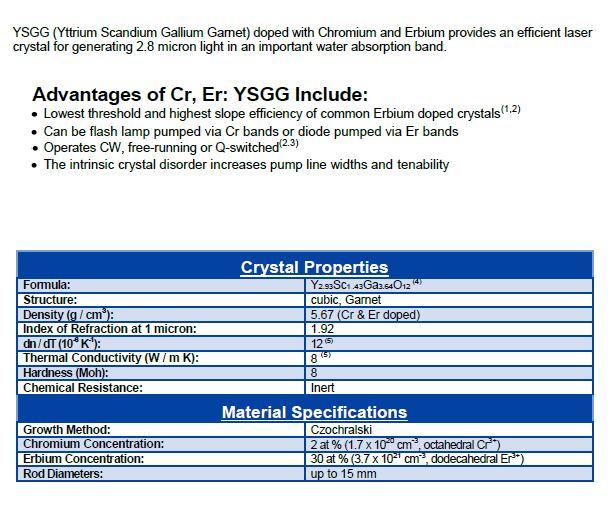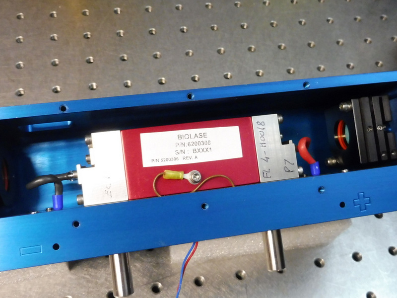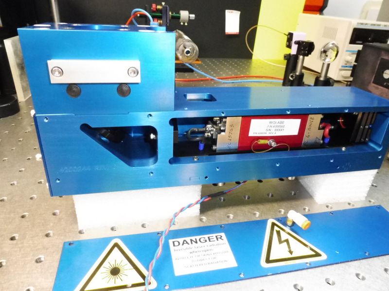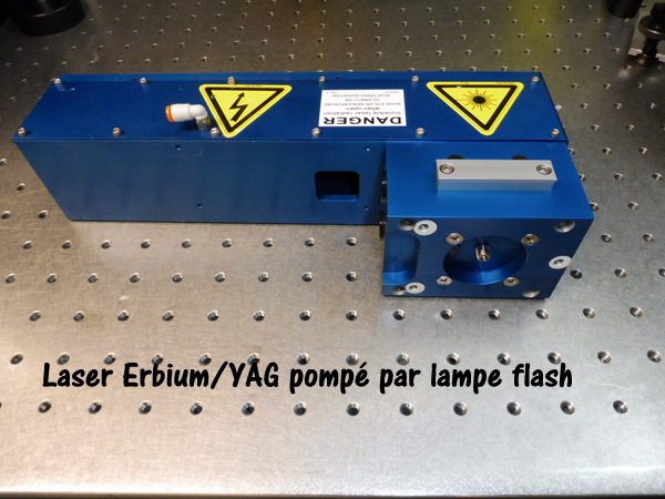Ce laser se compose d'un barreau Er:Cr YSGG de 3mm x 60mm pompé par un tube flash de 3 x 60mm dans une cavité refroidie par une circulation forcée d'eau dé-ionisée permettant de travailler à une fréquence de répétition de 20pps. La longueur d'onde d'émission est de 2.797 microns c'est un laser à 4 niveaux. La sortie se fait sur une fibre optique. Le résonateur se compose d'un miroir totalement réflecteur 99.6% @2797nm et d'un miroir à 90%R formant un résonateur instable r=-500mm permettant de corriger l'effet de lentille du barreau amplificateur