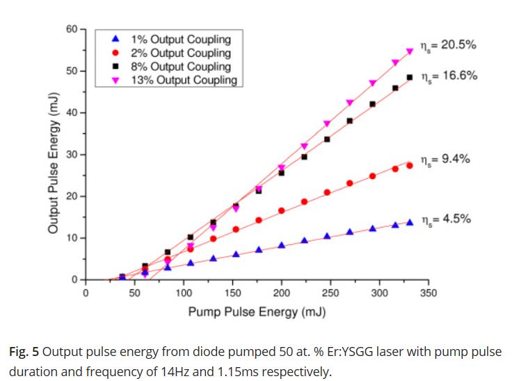 L'énergie de sortie en mJ en fonction de la transmission du miroir de sortie est donné pour un barreau YSGG pompé en QCW par une diode laser. Pour un barreau de même dimension en Er,Cr TAG l'énergie de sortie est 2 fois plus petite !